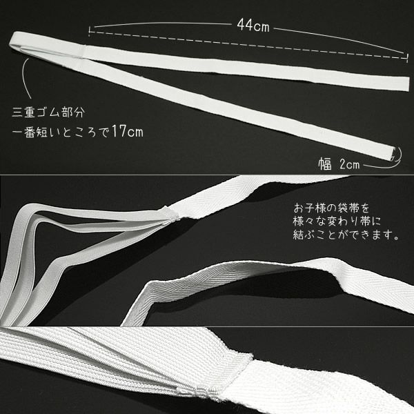 お子様用の三重仮紐です。七五三などの際のお子様の袋帯に変わり結びにかかせないアイテムです。