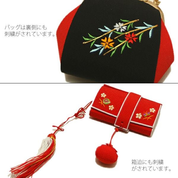 他の画像を見る 送料無料 七五三 お子様着物に 華やかな箱せこセット 【Prices down2】七五三 箱迫セット「黒色系 古典花柄」箱迫、バッグ、草履、帯締め、末広 日本製 七五三小物セット ひな祭り、桃の節句 No.315黒【メール便不可】kk★10%OFF 通常販売価格 ¥ 31,075 のところ きもの町価格 ¥ 11,741 税込 販売開始前です。 販売期間 2026/03/04 20:00 〜 2026/03/11 1:59 カートに入れる お気に入りに登録する