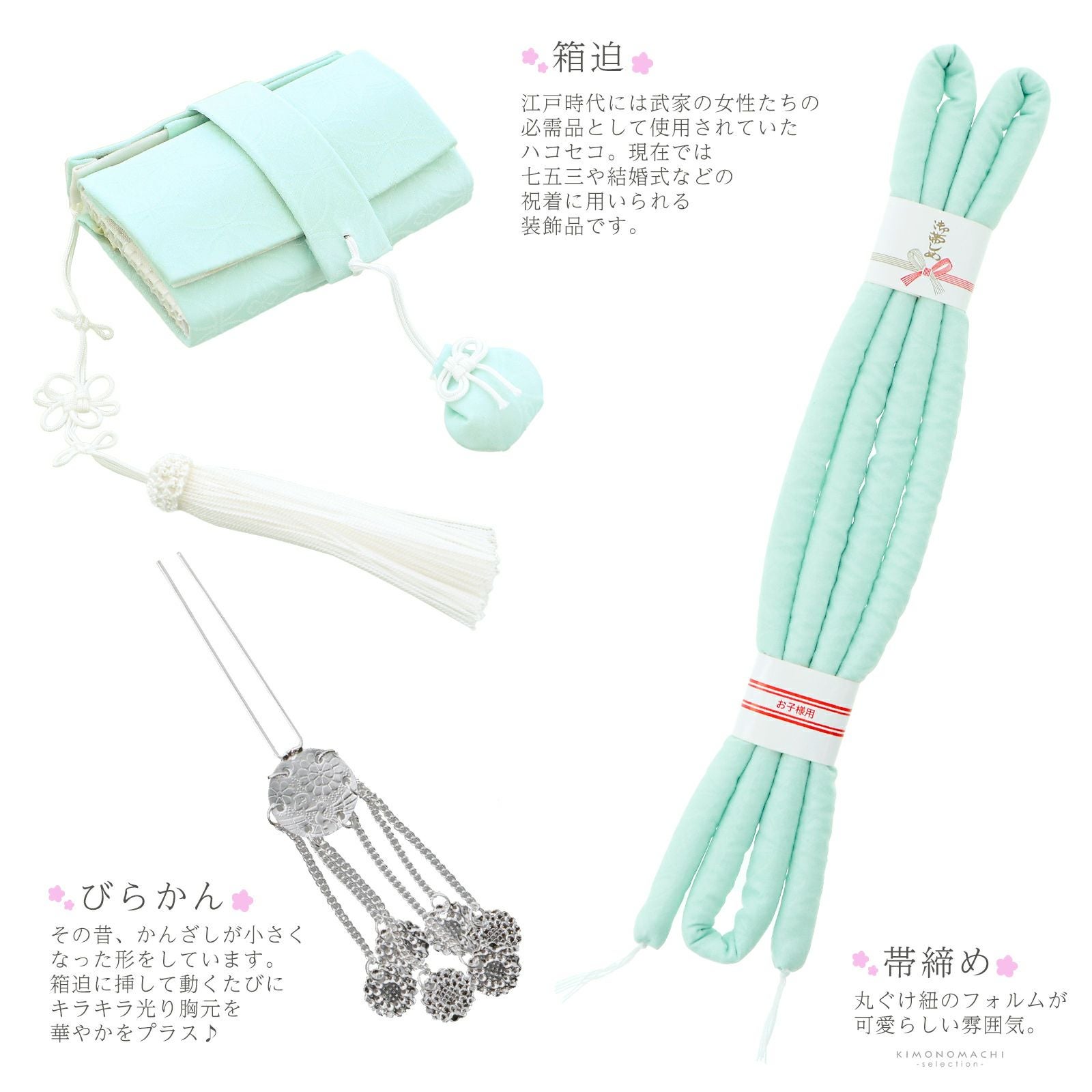 他の画像を見る 送料無料 7歳の女の子の七五三に 華やかな小物セット 七五三小物セット 7歳 ブランド SugarKei シュガーケイ 「ミントグリーン スカイフラワー」 女の子 女児用 四つ身着物に 7才 しごき(志古貴)、帯揚げ、帯留め、帯締め(丸ぐけ)、箱迫、びらかん、扇子(末広)、半襟(半衿) 七才のお祝い着向け 【メール便不可】kk★20%OFF 通常販売価格 ¥ 62,700 のところ きもの町価格 ¥ 50,160 税込 販売開始前です。 販売期間 2026/03/04 20:00 〜 2026/03/11 1:59 詳細を見る お気に入りに登録する