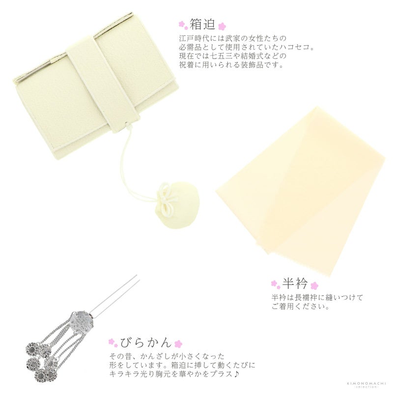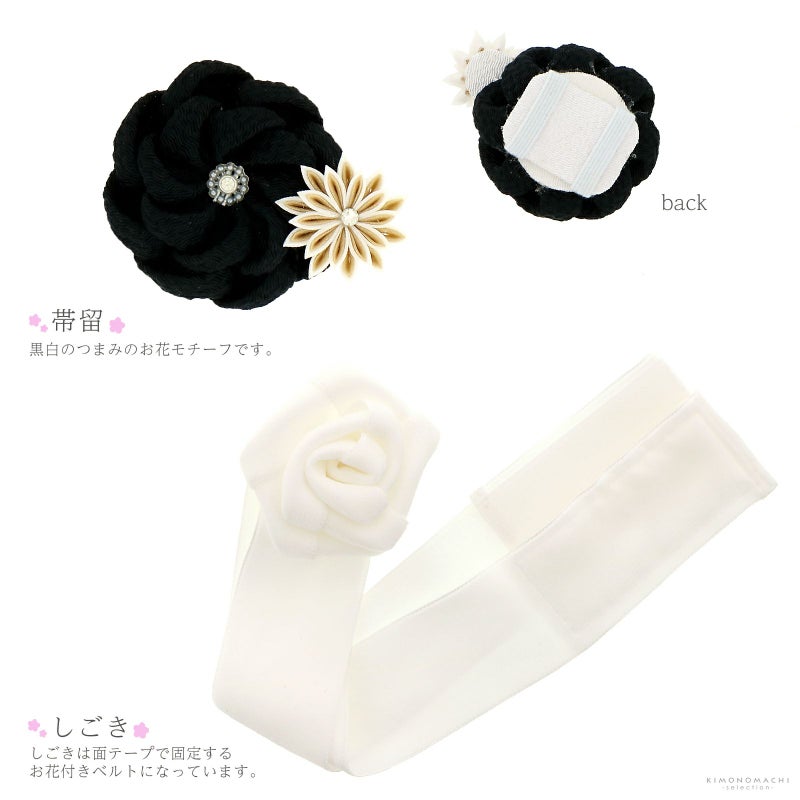 3. 【Prices down2】七五三小物セット 7歳 ブランド JAPAN STYLE ジャパンスタイル 「白 丸ぐけ紐、黒×白 つまみ細工帯留め」 女の子 女児用 四つ身着物に 7才 帯留、しごき、帯揚げ、帯締め、箱迫、半衿、びらかん 七才のお祝い着向け 【送料無料】 【メール便不可】kk★10%OFF