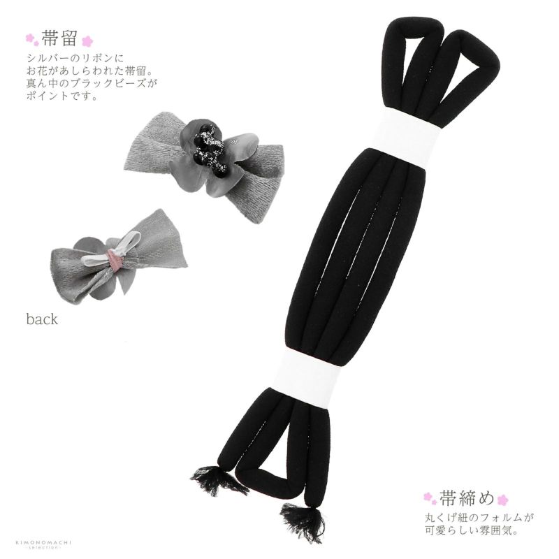 帯留め、しごき、帯揚げ、帯締め、箱迫、半衿、びらかんの7点が入った、7歳の女の子向けの小物セットです。女の子らしさとモダンな雰囲気が可愛いセットです。