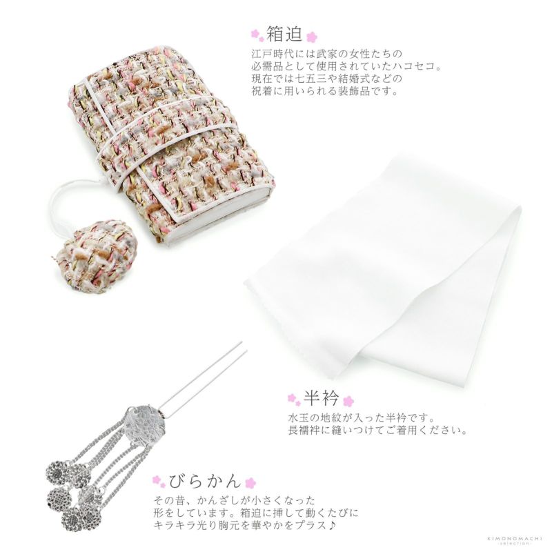 【商品内容】帯留め、しごき(志古貴)、帯揚げ、帯締め(丸くげ)、箱迫、半衿、びらかんの計7点