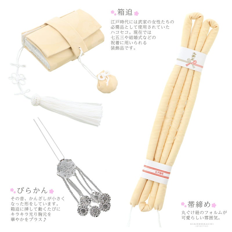 七五三 7歳の女の子に 華やかな草履バッグと箱迫セット 七五三 着物 7歳向け 箱迫セット「エクルベージュ 花菱七宝」日本製 7歳向け 子供着物 女の子の着物 筥迫 草履 バッグ ビラカン 帯締め 末広【メール便不可】kk★10%OFF