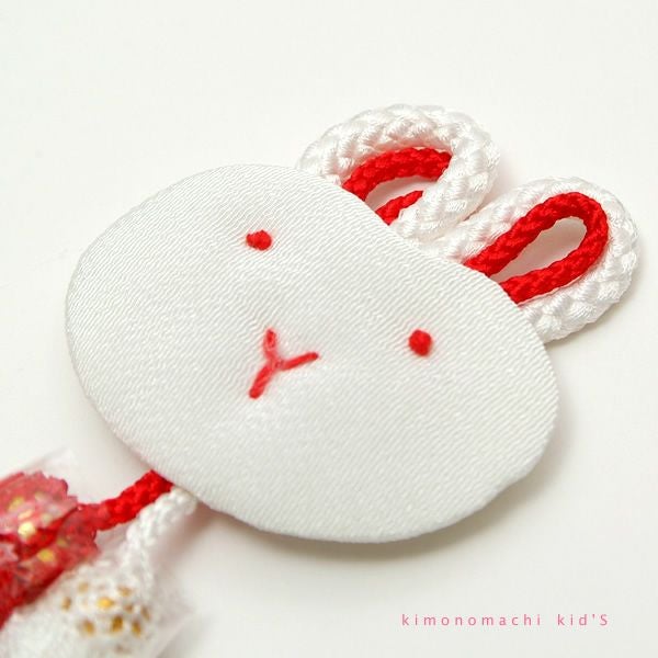 三歳の女の子が七五三でかぶる被布コートの両胸につける飾りです。かわいい白兎のデザインです。サイズは約13cm×5cmです。(手作業のため商品によって前後いたします)
