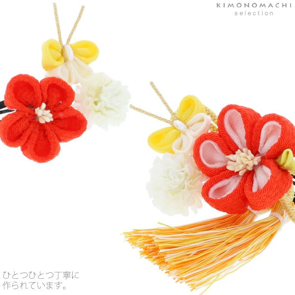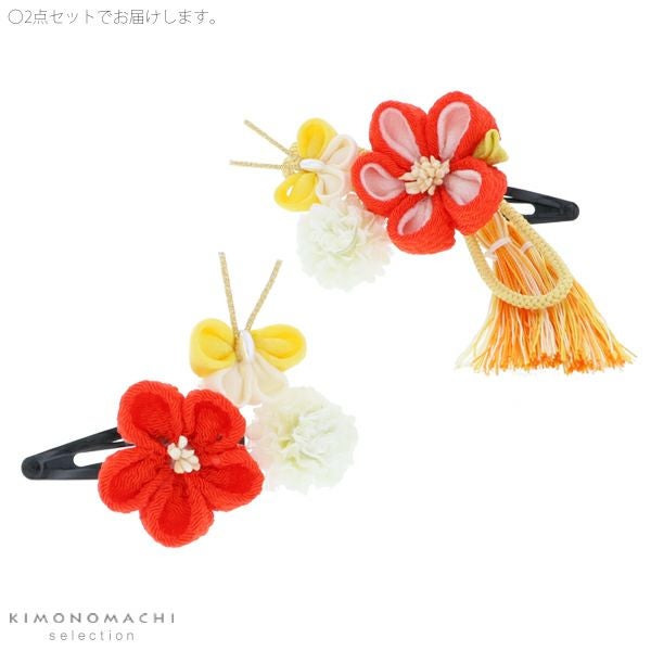 【Prices down5】七五三髪飾り2点セット「オレンジのつまみのお花と蝶、黄色の紐、房飾り」つまみ細工 桃の節句、お正月にも 簪 子供 三歳の女の子に、七歳、五歳の女の子にも (1776)【メール便不可】ss2509wkk25