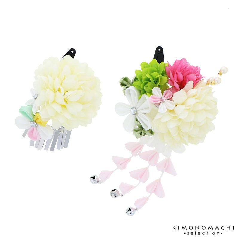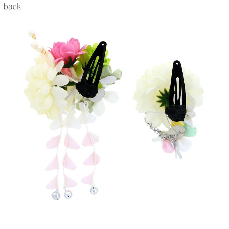 お子様用の髪飾り2点セットです。つまみのお花の可愛らしく華やかな雰囲気。房飾りがついていて、ゆらゆらと華やかさをプラスしてくれます。パッチン留めタイプなので、髪の短いお子様でもお使いいただきやすい髪飾りです。七五三にはもちろん、桃の節句、お正月などのお着物に合わせて。ほかの髪飾りと合わせてつけても華やかです。