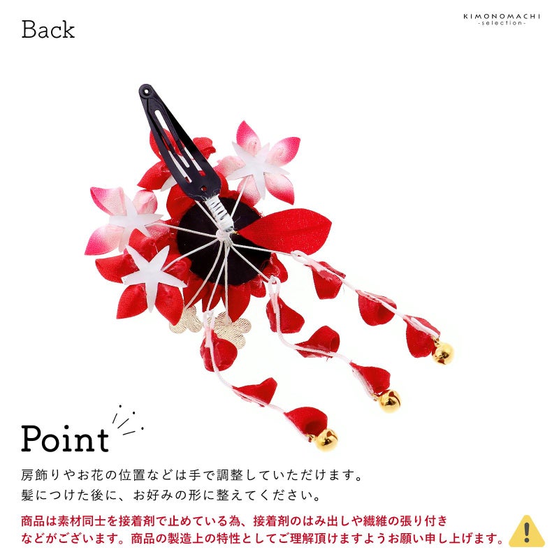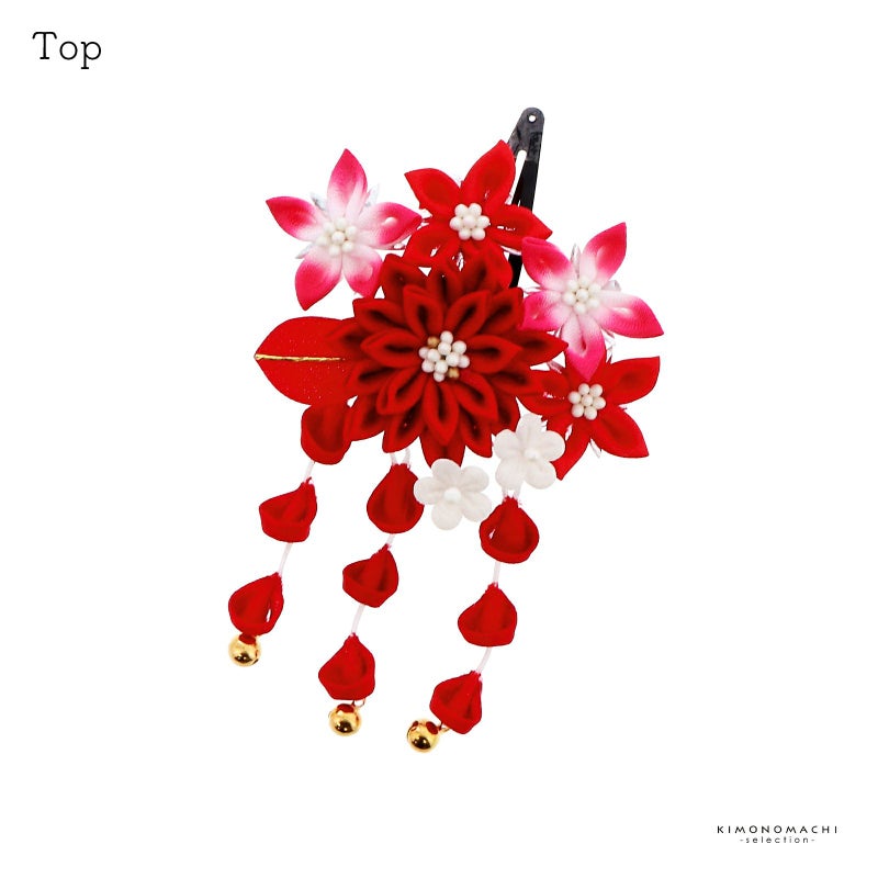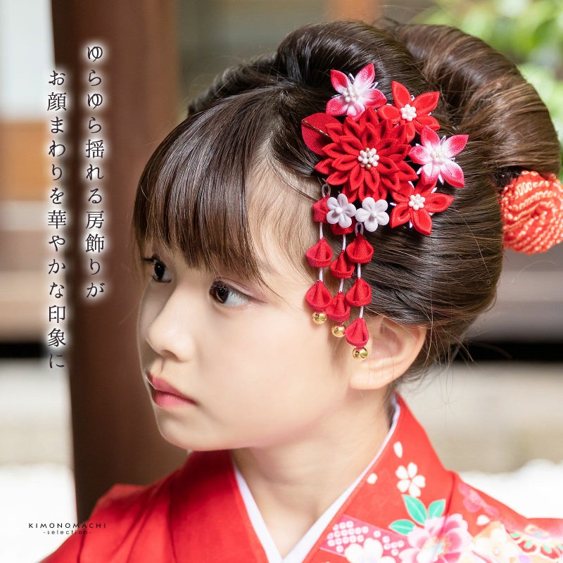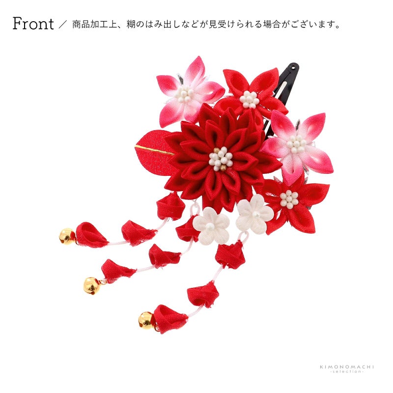 つまみのお花の可愛らしく華やかな雰囲気。房飾りがついていて、ゆらゆらと華やかさをプラスしてくれます。パッチン留めタイプなので、髪の短いお子様でもお使いいただきやすい髪飾りです。七五三にはもちろん、桃の節句、お正月などのお着物に合わせて。ほかの髪飾りと合わせてつけても華やかです。