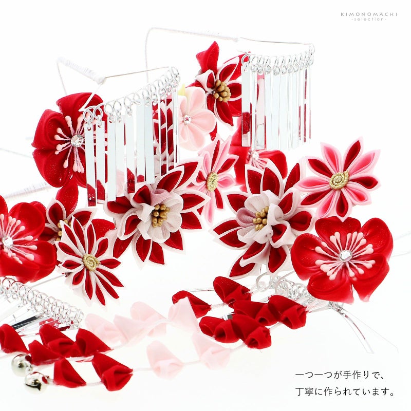 【色柄】紅白にピンクを基調とした二重剣つまみのお花、赤ぼかしの丸つまみのお花、ブロンズゴールドのペップの花飾りに銀色のビラ飾り。紅白の二重剣つまみのお花、赤ぼかしの丸つまみのお花に銀のビラ飾り。紅白にピンクの二重剣つまみのお花、赤ぼかしの丸つまみのお花、銀のビラ飾り、赤と薄ピンクのつまみの房飾り。