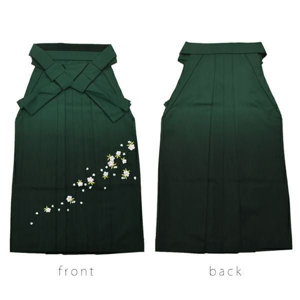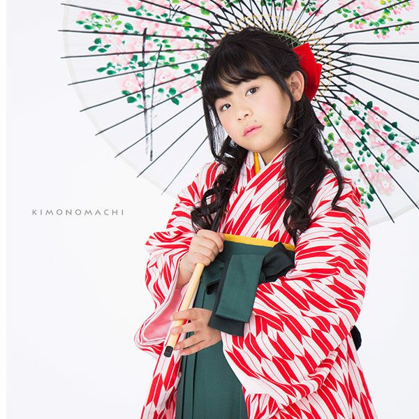 【カラー】着物は、赤×白色の矢羽模様。袴は、緑色から暗く濃い緑色のぼかしのグラデーション、桜の刺繍。