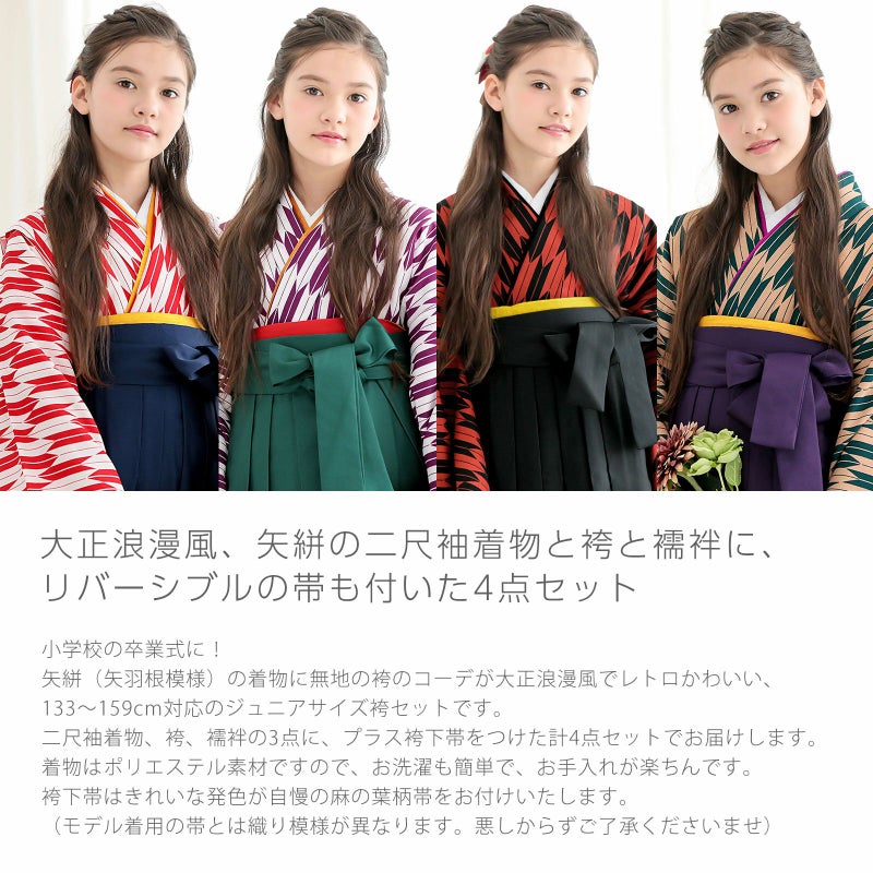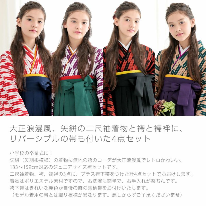 小学校の卒業式に!矢絣の着物に無地の袴のコーデが大正浪漫風でレトロかわいい、133~159cm対応のジュニアサイズ袴セットです。