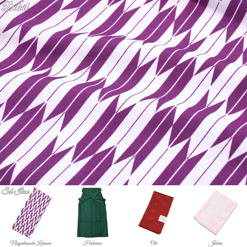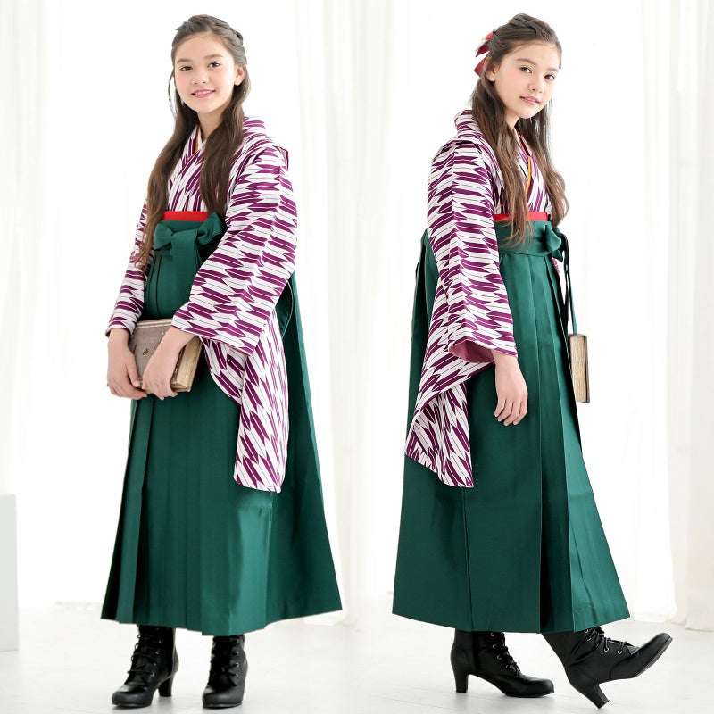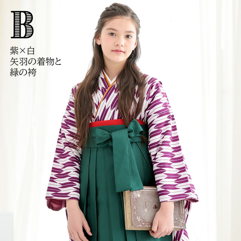 B紫×白の矢羽の着物+緑の袴