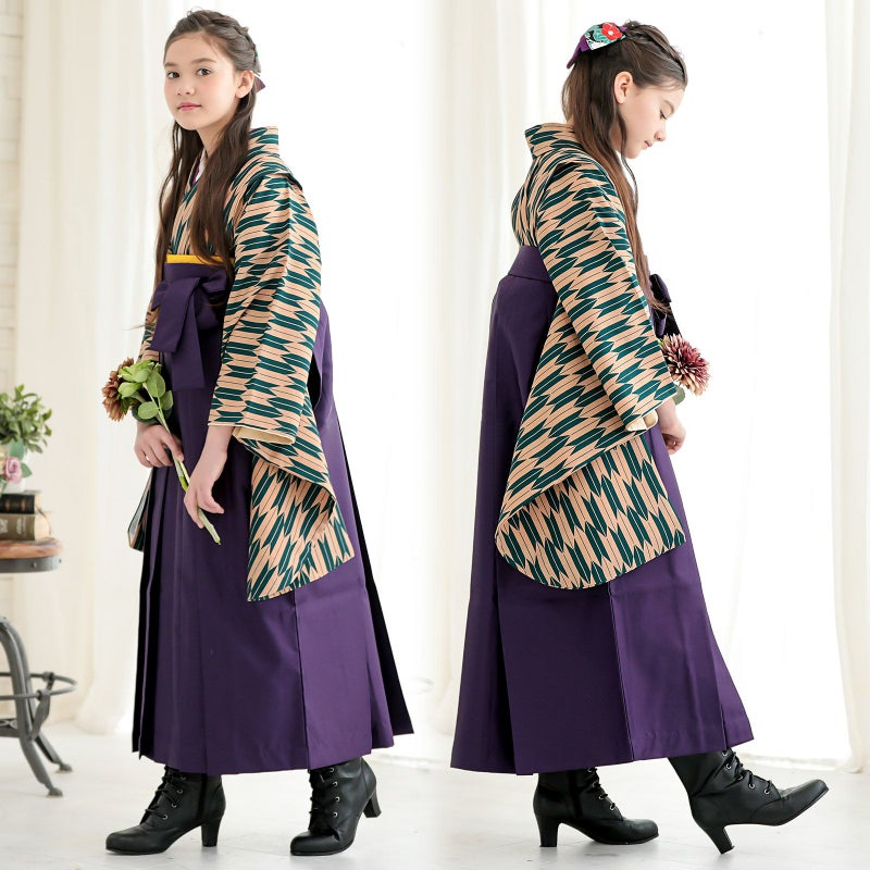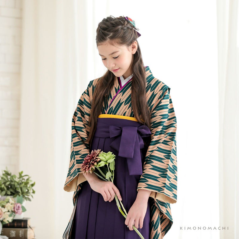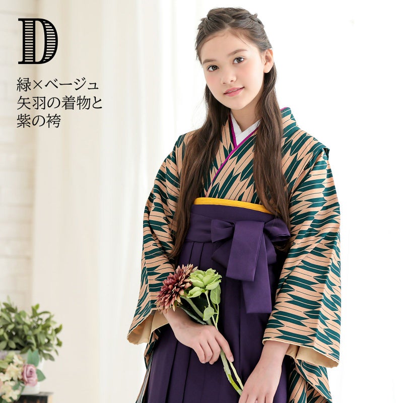 D緑×ベージュの矢羽の着物+紫の袴