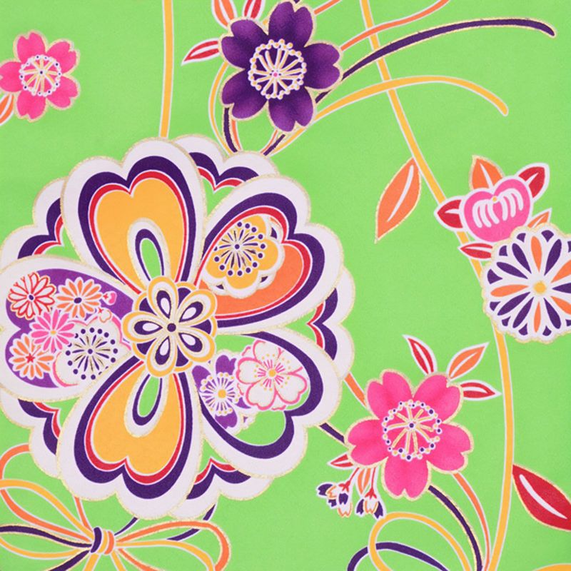 →襦袢はこちら→襦袢の身上げ・肩上げはこちら【カラー】鮮やかな黄緑色地に、桜や菊の花とお結び紐の文様を描いて、鮮やかな地色に可憐な文様が映えるデザインです。