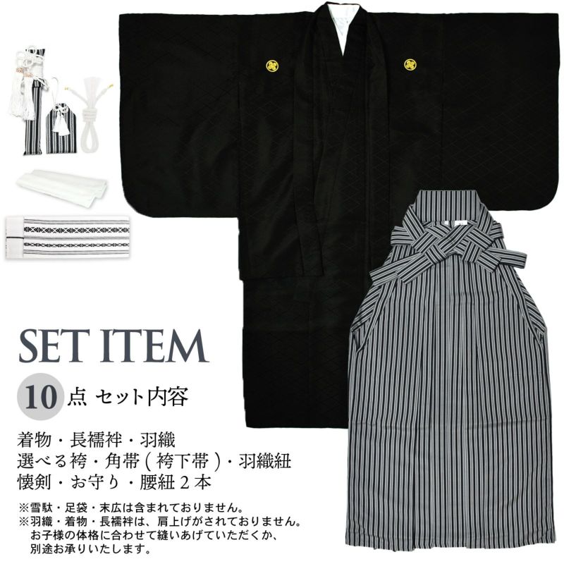 【商品内容】着物、長襦袢、羽織、袴、角帯、羽織紐、懐剣、お守り、腰紐2本