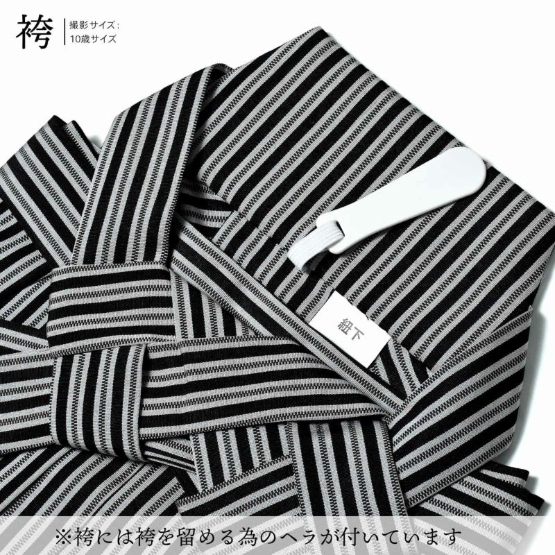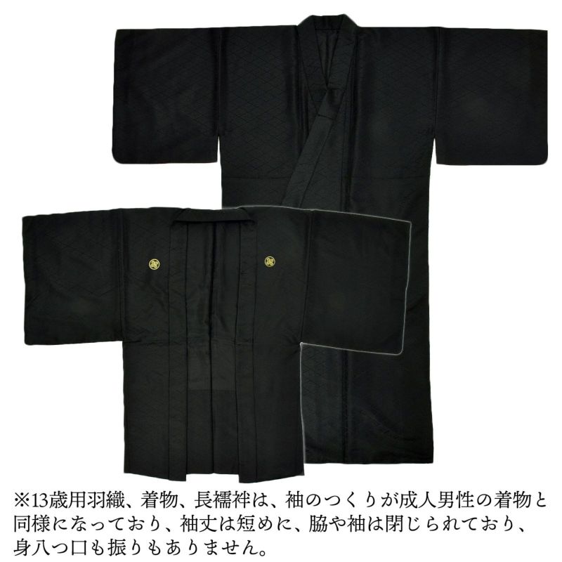 ※13歳用は、袖のつくりが成人男性の着物と同様になっており、袖丈は短めに、脇や袖は閉じられており、身八つ口も振りもありません。(モデルは10歳用を着用しております)