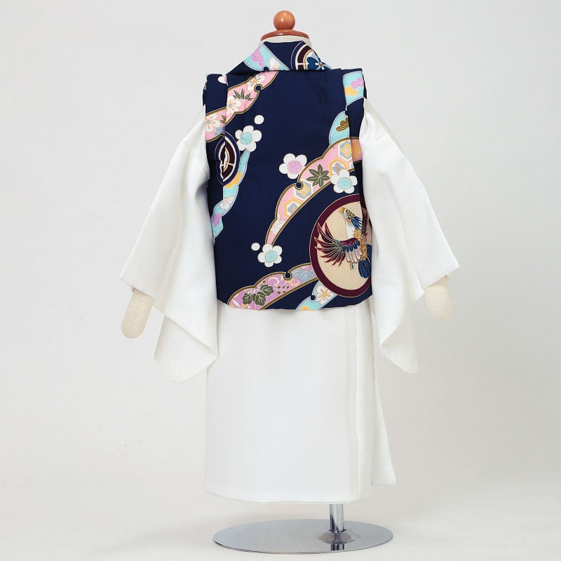 被布コートは紺地に薄ピンクや藤色、水色の雪芝文様。白い梅の花。ベージュに臙脂や紺、金茶色や緑、赤紫色の鷹、酢漿草、笠などの丸紋。砂子の金彩。つまみ細工の被布飾りが付いています。二部式の着物は白。重ね衿は紗綾形地紋の明るい黄緑色。
