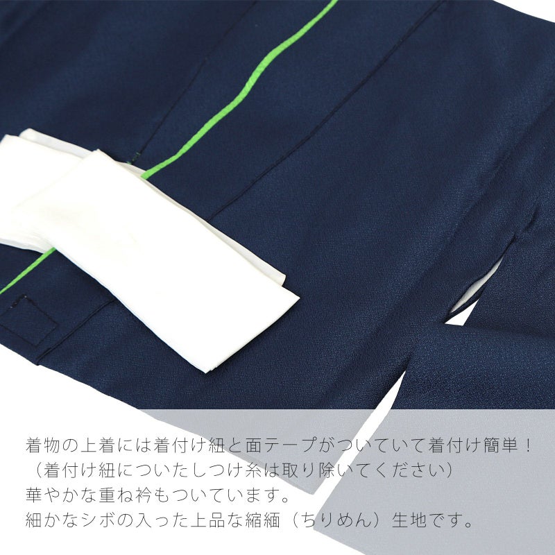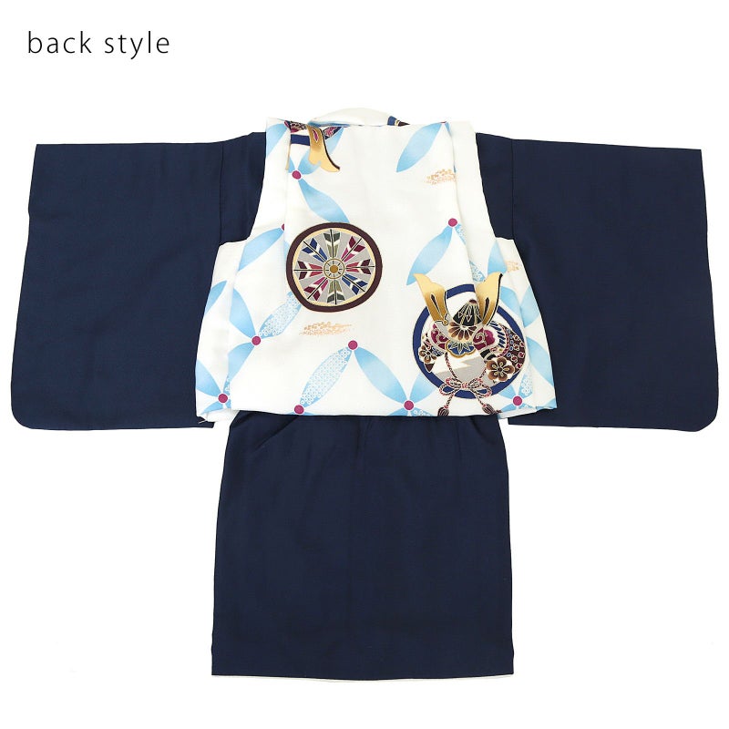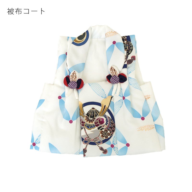 被布コートは白地に水色の星七宝繋ぎ。紺や茶、金茶色や緑、赤紫色の兜や矢車の丸紋。砂子の金彩。つまみ細工の被布飾りが付いています。二部式の着物は紺。重ね衿は紗綾形地紋の明るい黄緑色。