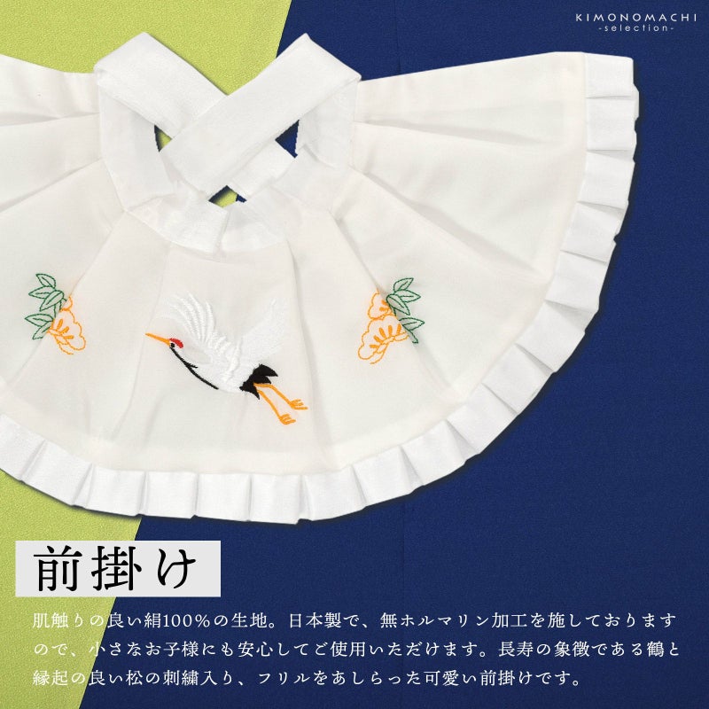 長寿の象徴である鶴と縁起の良い松の刺繍入りです。初着の上に出してご使用ください。