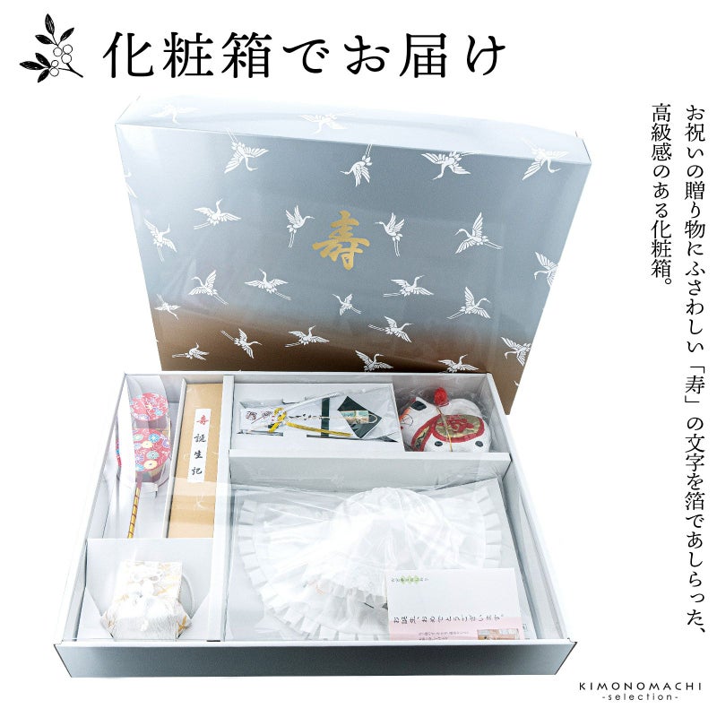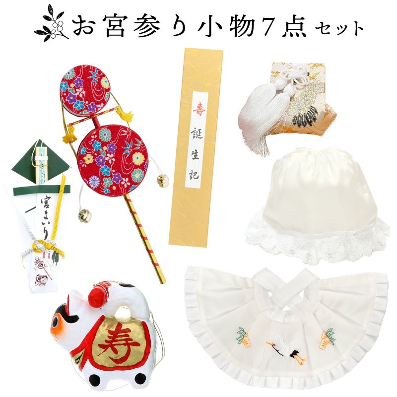 【商品内容】前掛け、帽子、お守り袋、熨斗扇子、犬張り子、でんでん太鼓、誕生記の7点セット