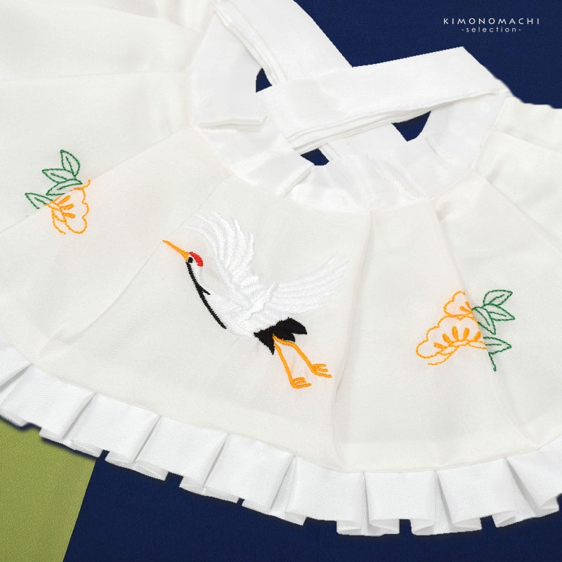 長寿の象徴である鶴と縁起の良い松の刺繍入りです。初着の上に出してご使用ください。