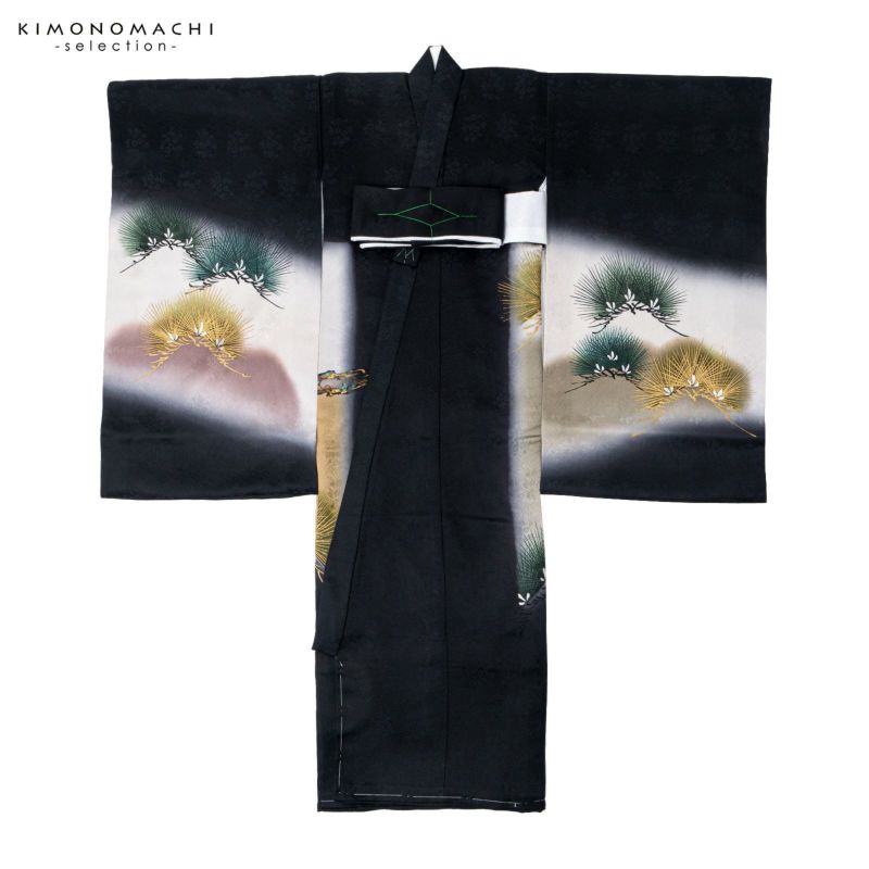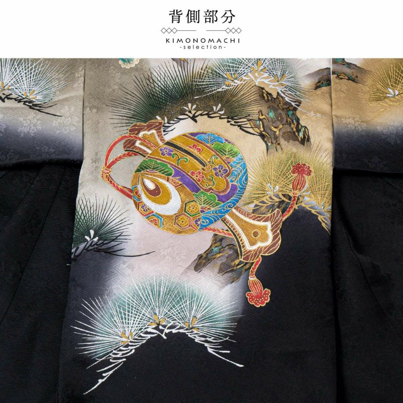 着物は紗綾形に花の地紋、黒地にベージュの腰替わり。背には、刺繍で表現された緑の龍、紫、白茶、紺鼠色などの配色の兜。細やかな技法で施された艶やかな刺繍にポイントの金糸が煌びやかさを添えます。黒に深緑や茶色の手描き調の松に金彩、銀彩が荘厳な雰囲気。さらに金茶や赤、紫、金泥、銀泥の小槌。襦袢は白色に疋田文様の地紋。袖の振りは疋田文様の地紋の淡い水色。