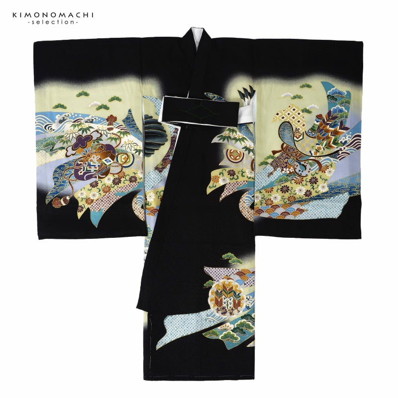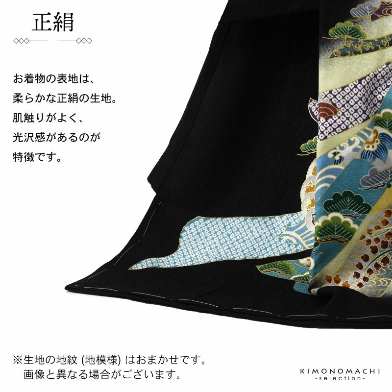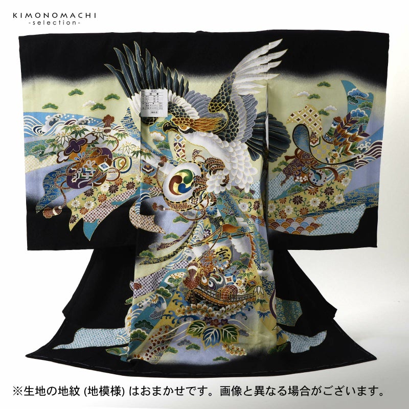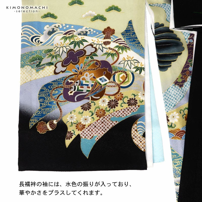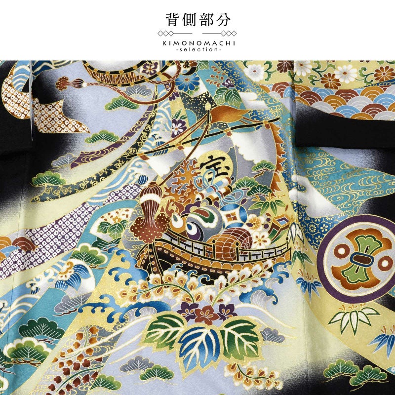 【色柄】着物は地紋のある黒地に淡い青磁色の腰替わり。背には茶色の冠羽に鉄紺や青灰色、白の翼を広げた鷹。金彩や刺繍が上品な煌びやかさを添えています。茶色に青、緑、黒、海老茶色など多彩な色使いの太鼓や宝船。さらに吉祥文様を入れた薄灰色や浅葱色の束ね熨斗。襦袢は白。袖の振りは淡い水色。