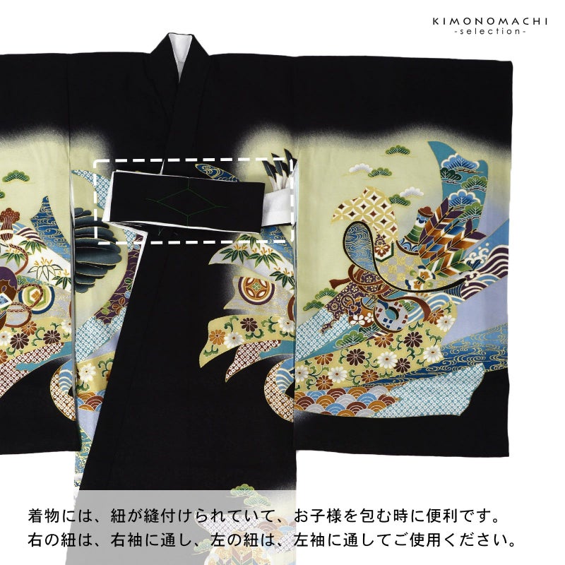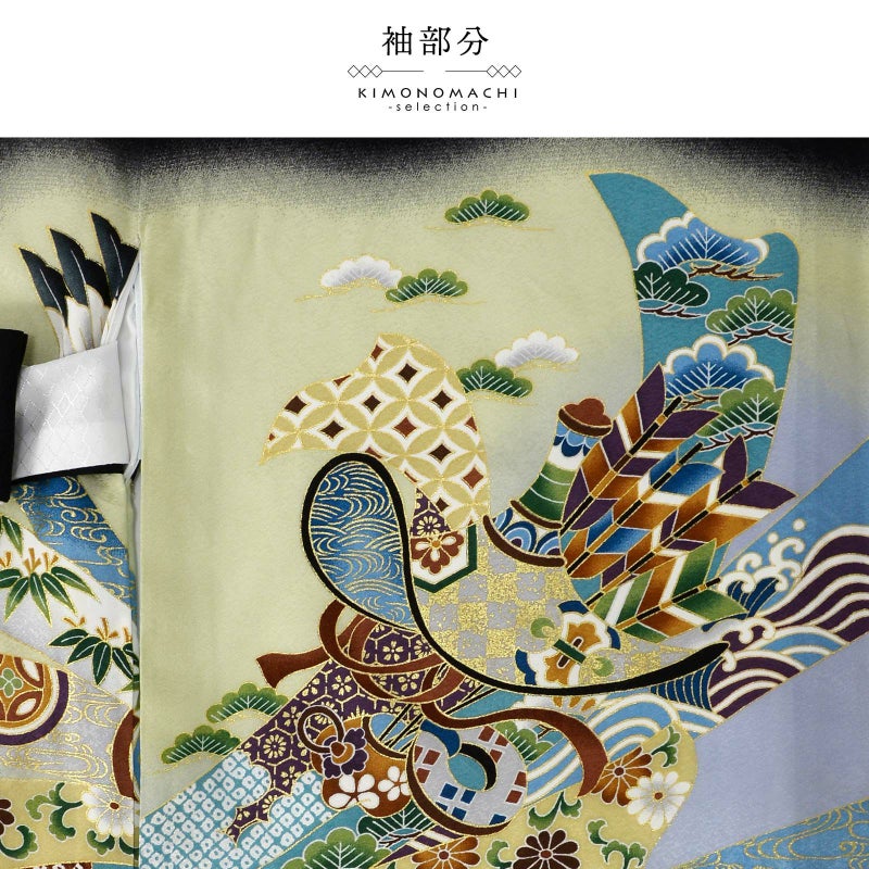 男の子らしく勇ましい、カッコイイ雰囲気。美しい発色の生地に美しい模様。長襦袢の中に水色の振りが入っており、お洒落な雰囲気をプラスしてくれます。