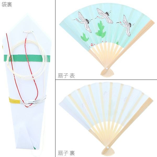 【カラー】のし袋の外側は白色、内側は緑色。扇子は、淡い青緑色に鶴の柄。