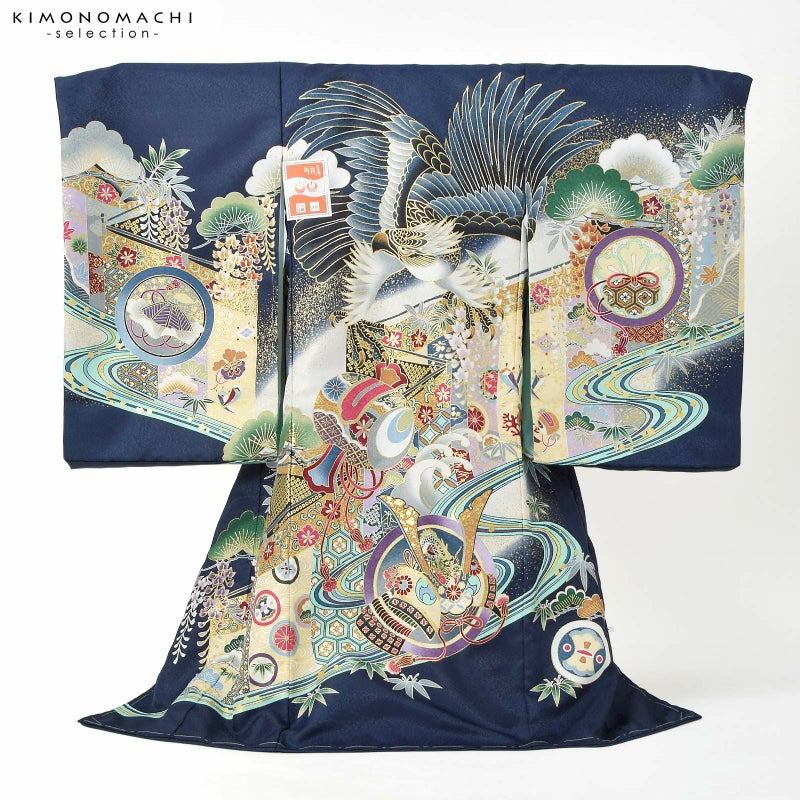 着物は細かな地紋の紺藍地に白のぼかし。背には鉄紺や青灰色、白の翼を広げた鷹。淡いクリーム色に青、薄紫、臙脂、金茶など多彩な色使いの幔幕に、松藤。鮮やかな白緑色の流水が大胆に文様を区切り、さらに兜や宝尽くしの丸紋など。大胆な色使いに金彩が上品な煌びやかさを添えています。襦袢は白の市松文様の地紋。袖の振りは淡い水色。
