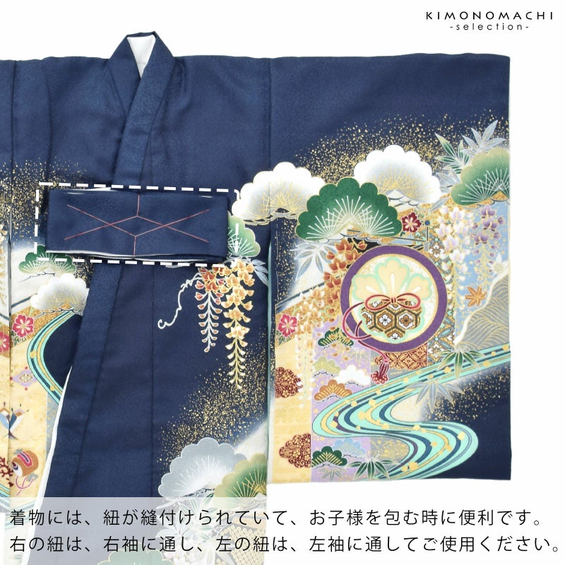 着物には紐が縫い付けられていて、お子様を包む時に便利です。右の紐は右袖に通し、左の紐は左袖に通してご使用ください。