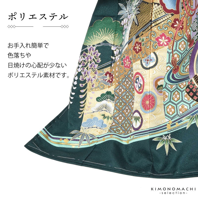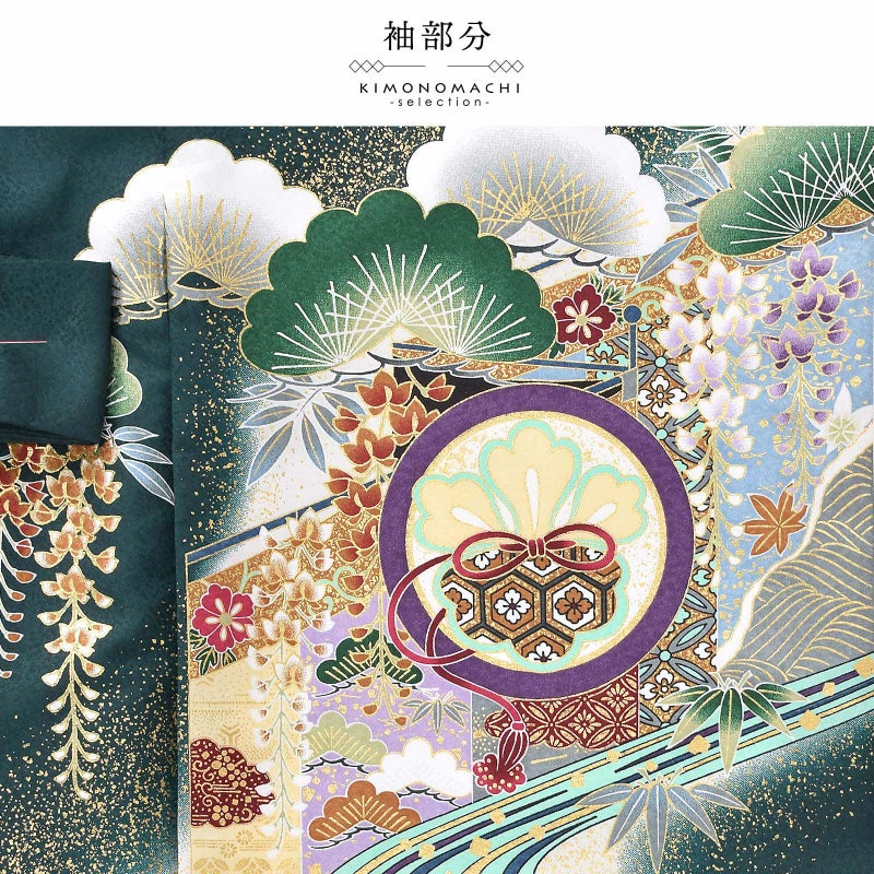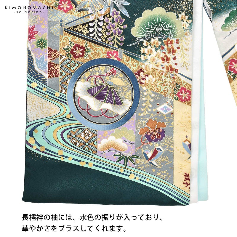 着物は細かな地紋の深緑地に白のぼかし。背には鉄紺や青灰色、白の翼を広げた鷹。淡いクリーム色に青、薄紫、臙脂、金茶など多彩な色使いの幔幕に、松藤。鮮やかな白緑色の流水が大胆に文様を区切り、さらに兜や宝尽くしの丸紋など。大胆な色使いに金彩が上品な煌びやかさを添えています。襦袢は白の市松文様の地紋。袖の振りは淡い水色。