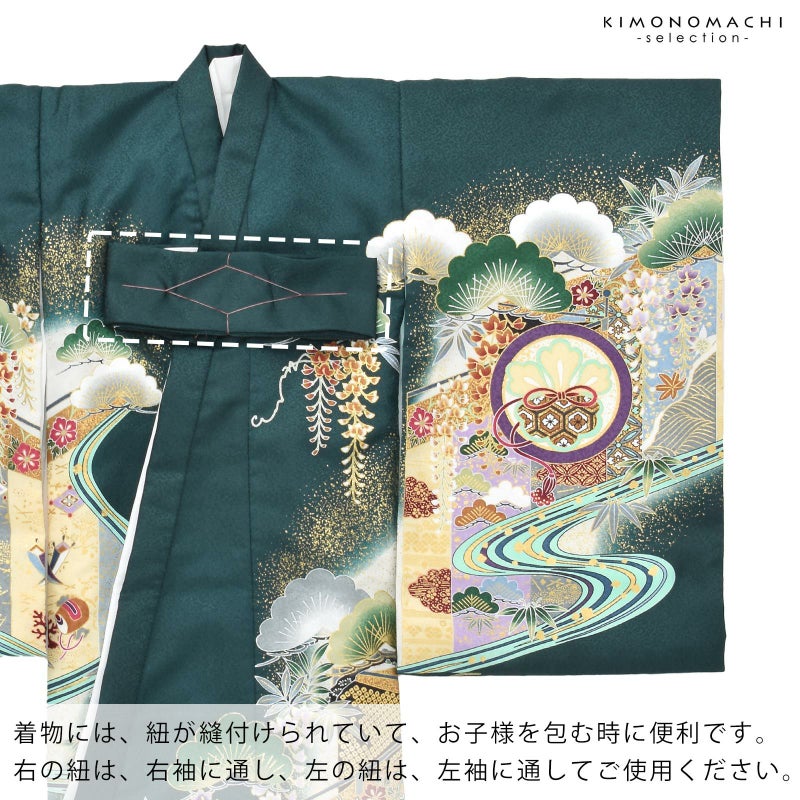 着物には紐が縫い付けられていて、お子様を包む時に便利です。右の紐は右袖に通し、左の紐は左袖に通してご使用ください。