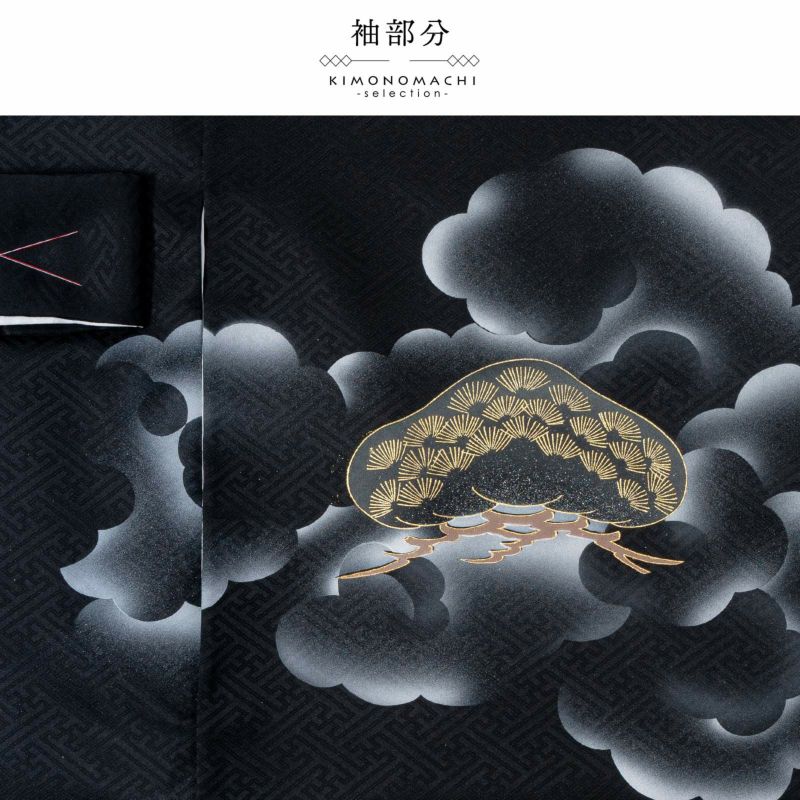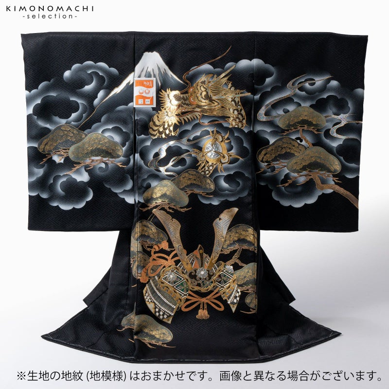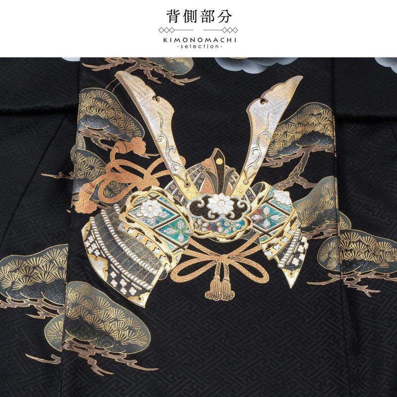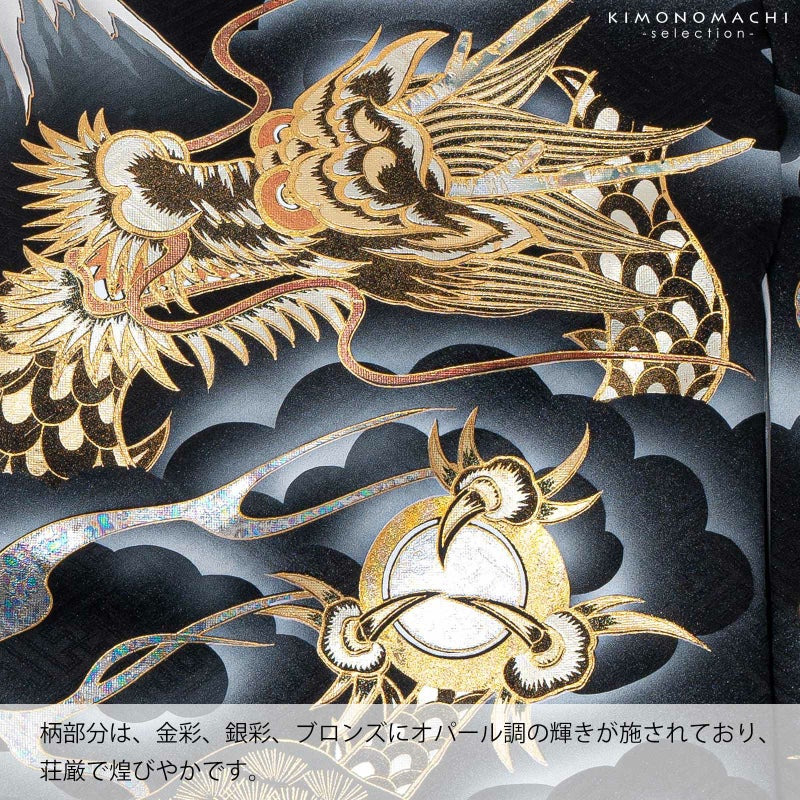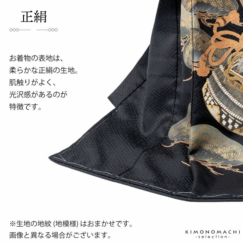 着物は紗綾形の地模様のある黒地。遠景に富士山、グレーの渦巻く雲に、宝珠を持った龍が表現されています。金彩、銀彩、ブロンズにオパール調の輝きが荘厳で煌びやかです。薄緑の松に、金銀エメラルドグリーンの兜。襦袢は地紋のある白。袖の振りは淡い水色。