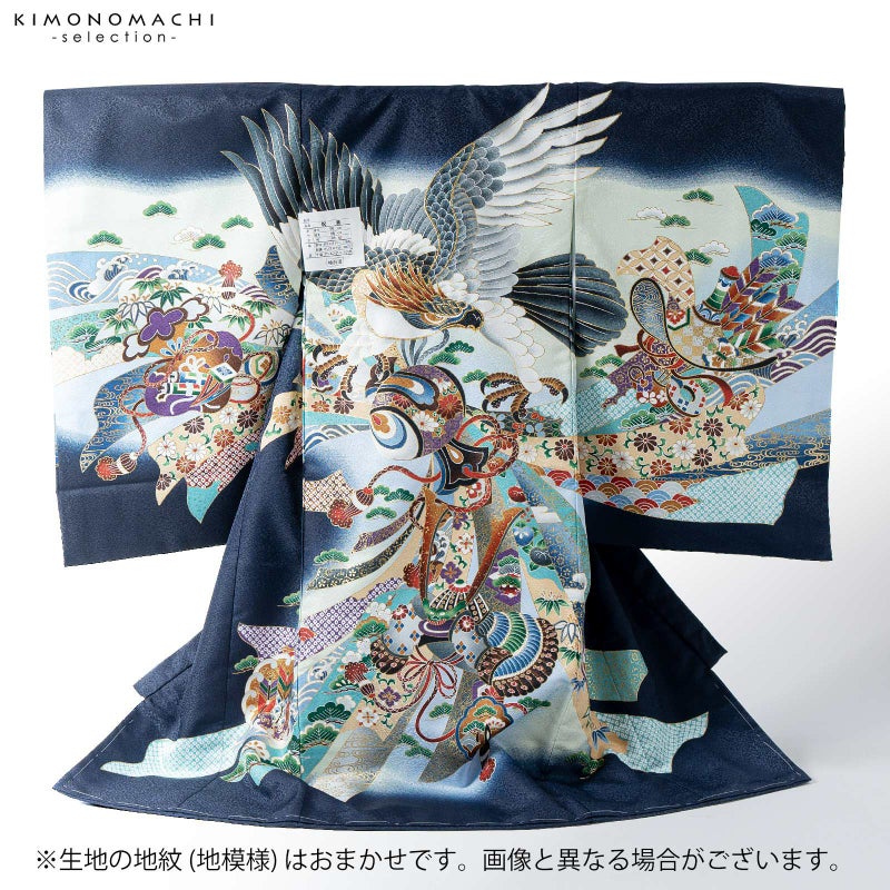 着物は細かな地紋のある濃紺地に淡い青磁色、水色の腰替わり。背には藍鉄色や灰色、白の翼を広げた茶の冠羽の鷹。金彩や刺繍が煌びやかさと重厚さを添えています。深緑や青磁色、ベージュに吉祥紋の入った束ね熨斗。さらに黒、滅紫色、茶色など多彩な色使いの小槌や兜、巾着など。襦袢は白色に疋田文様の地紋。袖の振りは疋田文様の地紋の淡い水色。