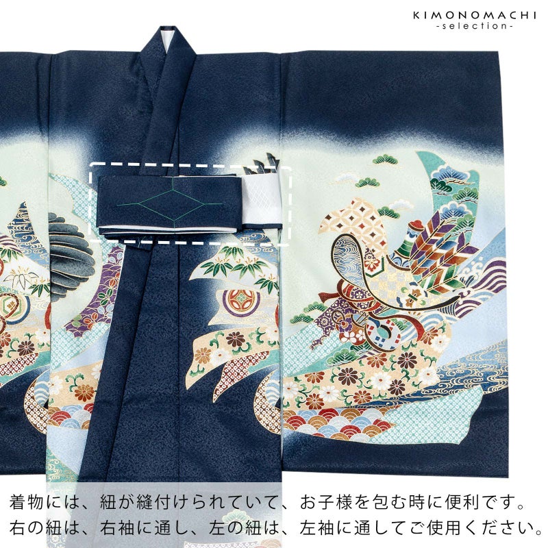 男の子らしく勇ましい、カッコイイ雰囲気。美しい発色の生地に美しい模様。長襦袢の中に水色の振りが入っており、お洒落な雰囲気をプラスしてくれます。