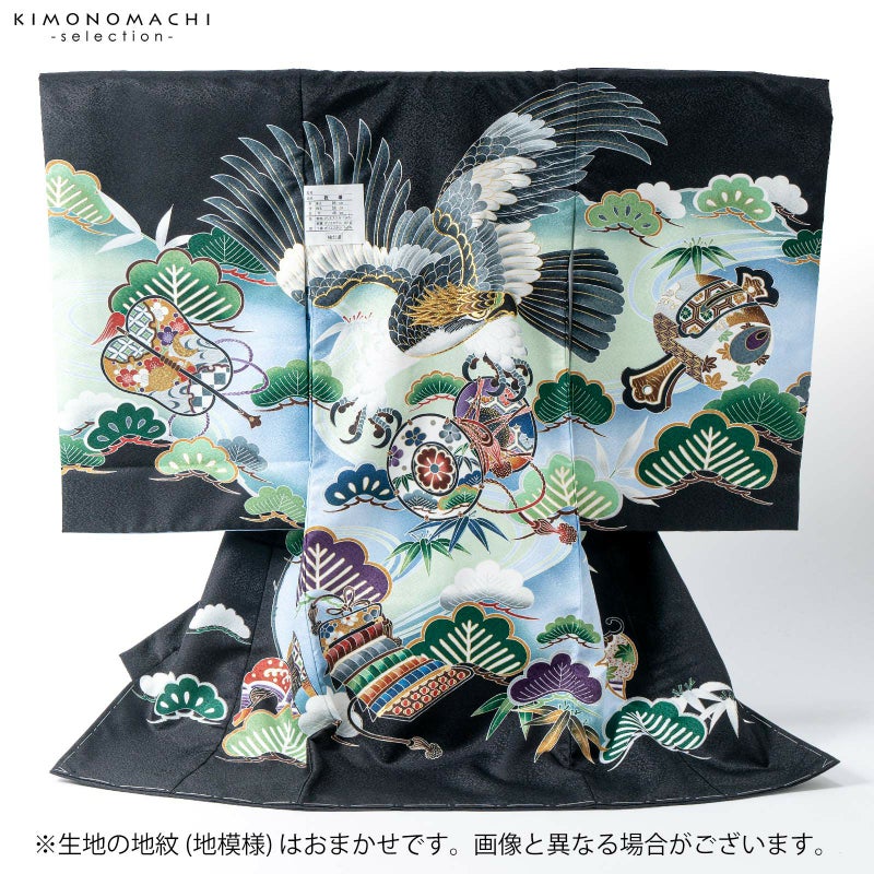着物は細かな地紋のある黒地。淡い青磁色、水色の腰替わりに流水紋。背には藍鉄色や灰色、白の翼を広げた茶の冠羽の鷹。金彩や刺繍が煌びやかさと重厚さを添えています。深緑や青磁色、ベージュに吉祥紋の入った束ね熨斗。さらに黒、滅紫色、茶色など多彩な色使いの小槌や兜、巾着など。襦袢は白色に疋田文様の地紋。袖の振りは疋田文様の地紋の淡い水色。