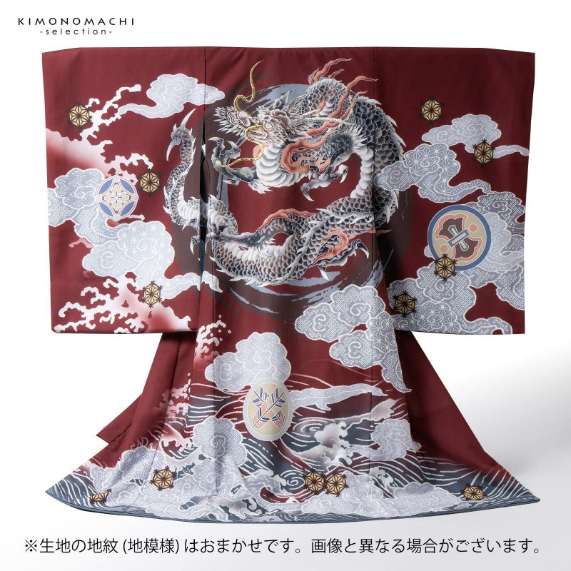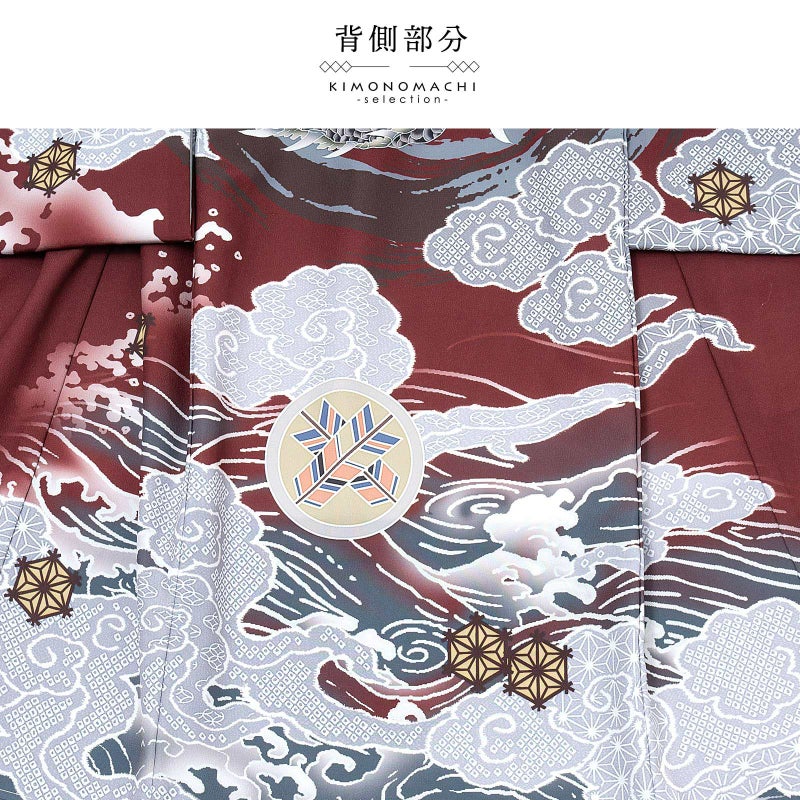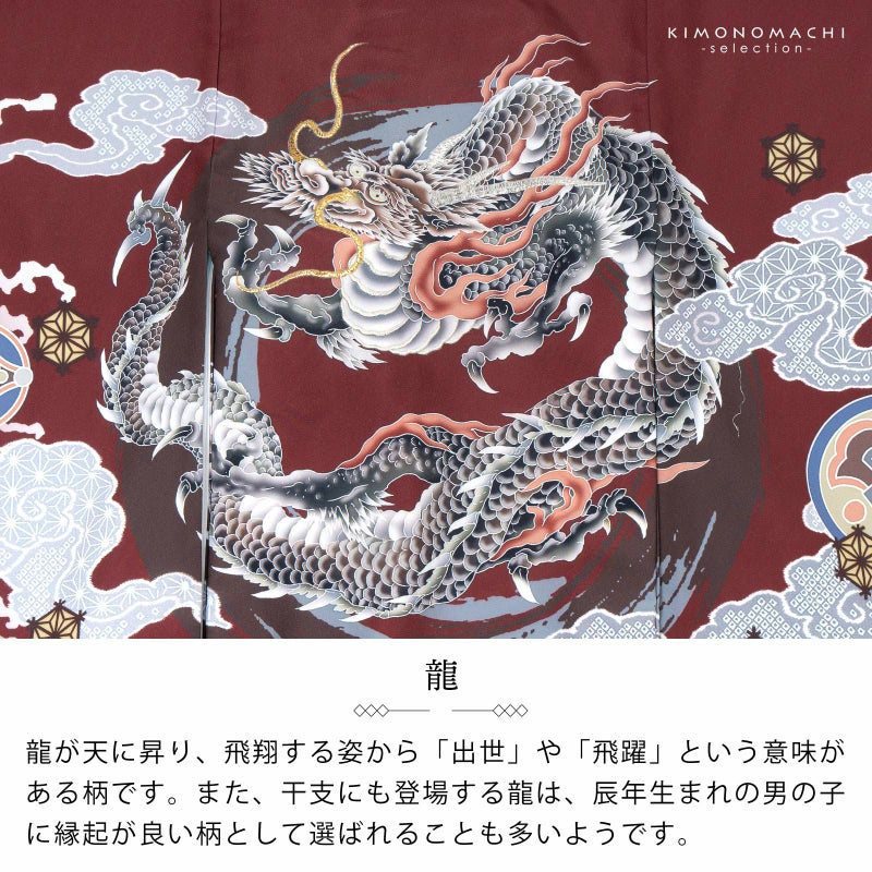 【色柄】着物はやや浅い赤茶色地にブルーグレーの裾ぼかし。背には茶色と青灰色の円相。その上に白に墨色、赤茶の龍。角やひげの金銀の刺繍が勇壮な煌びやかさを添えます。吉祥紋を詰めたグレーの雲。宝尽くしの丸紋や結晶のような形の麻の葉紋。襦袢は地紋のある白。袖の振りは淡い水色。