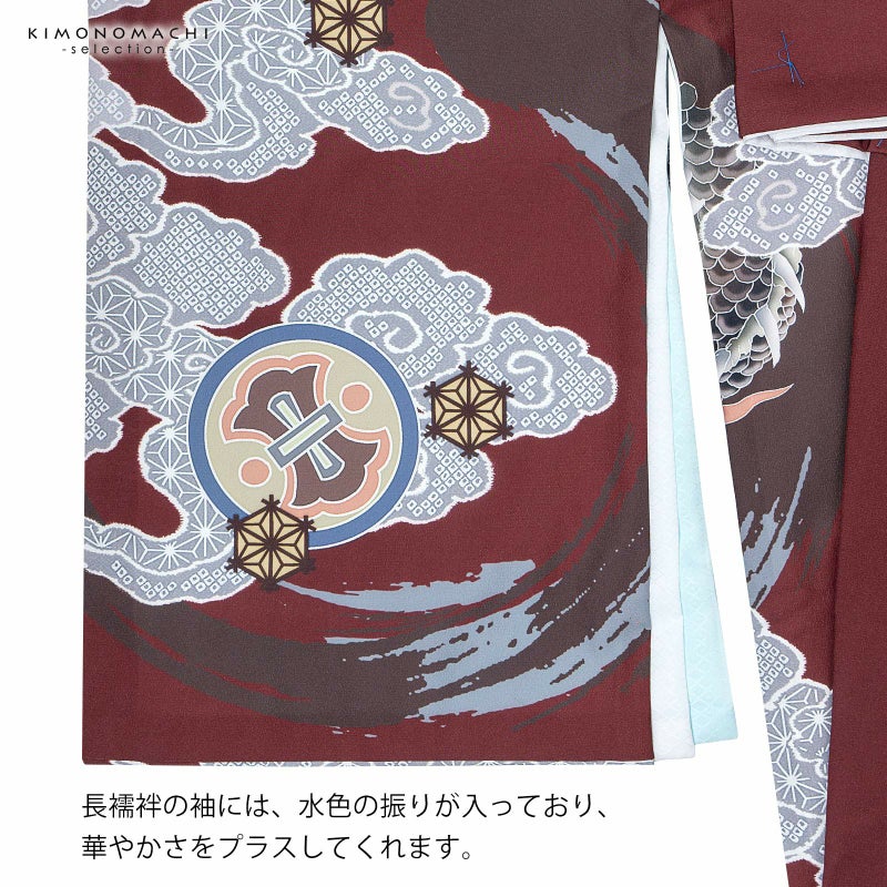 男の子らしく勇ましい、カッコイイ雰囲気。美しい発色の生地に美しい模様。長襦袢の中に水色の振りが入っており、お洒落な雰囲気をプラスしてくれます。