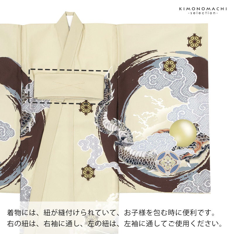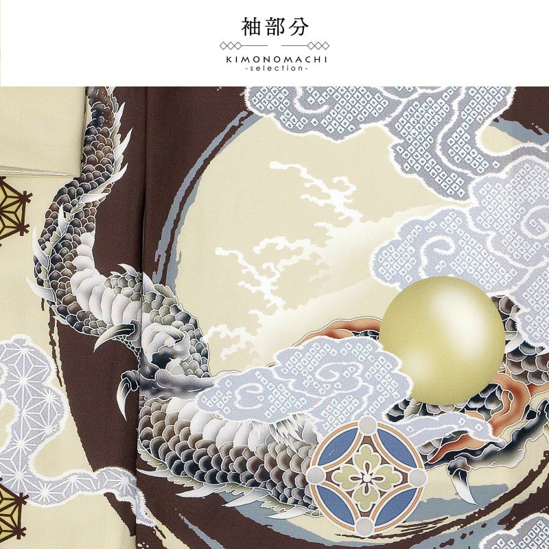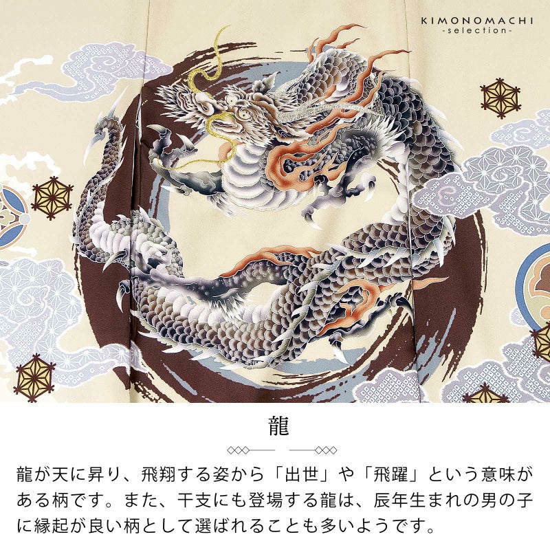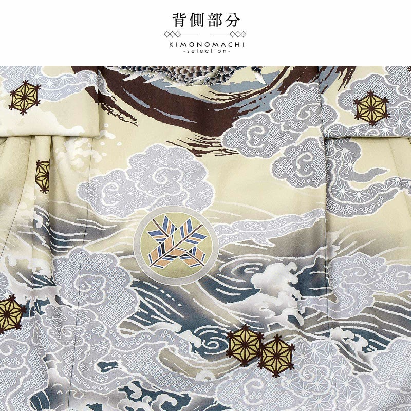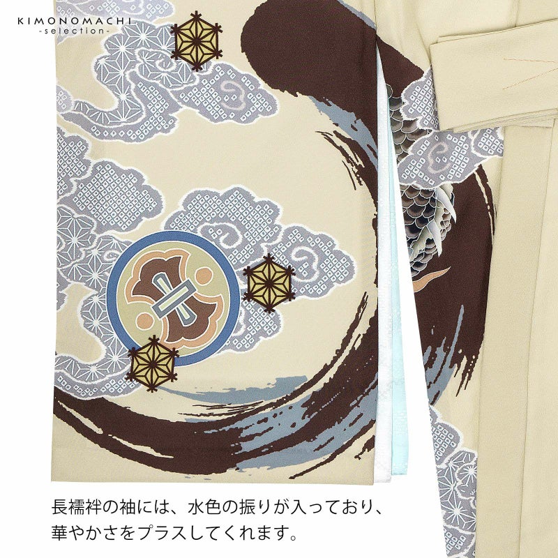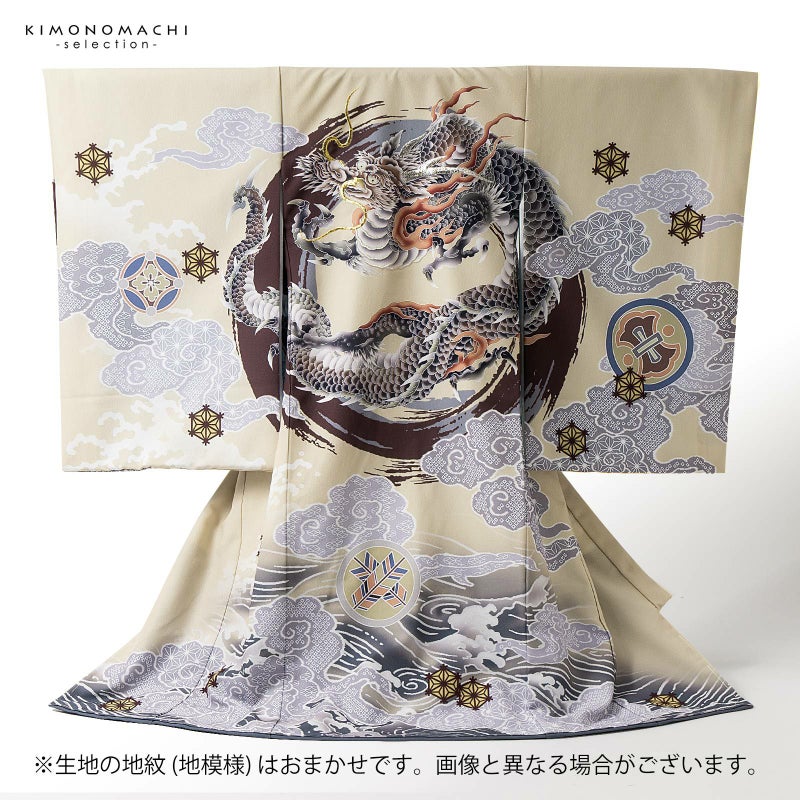 【色柄】着物はベージュクリーム色の地にブルーグレーの裾ぼかし。背には茶色と青灰色の円相。その上に白に墨色、赤茶の龍。角やひげの金銀の刺繍が勇壮な煌びやかさを添えます。吉祥紋を詰めたグレーの雲。宝尽くしの丸紋や結晶のような形の麻の葉紋。襦袢は地紋のある白。袖の振りは淡い水色。