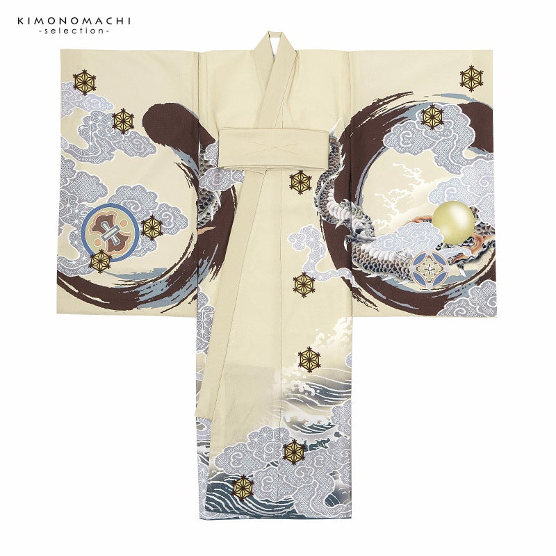 男の子らしく勇ましい、カッコイイ雰囲気。美しい発色の生地に美しい模様。長襦袢の中に水色の振りが入っており、お洒落な雰囲気をプラスしてくれます。