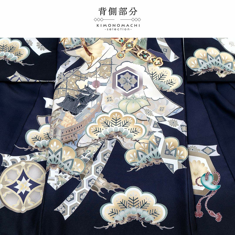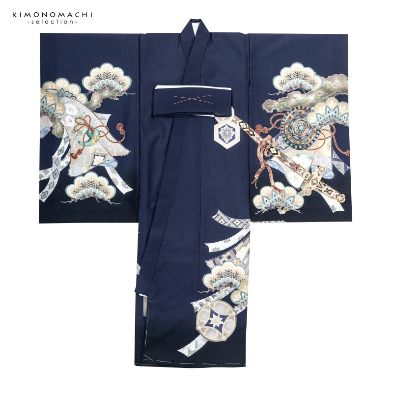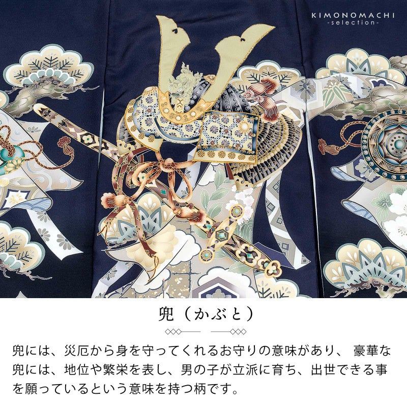 【色柄】着物はグレイッシュな青紫みの紺色地。背には金茶や薄黄を基調とした鍬形に獅子の前立て、小紋の吹返の兜。ポイントに金、銀の刺繍。背や袖に配された茶や紺、緑の配色の剣・鏡・勾玉の三種の神器。白茶やベージュ、薄緑の蔓帯に松、桜、宝船など吉祥柄がふんだんに配された柄行です。襦袢は地紋のある白。袖の振りは淡い水色。