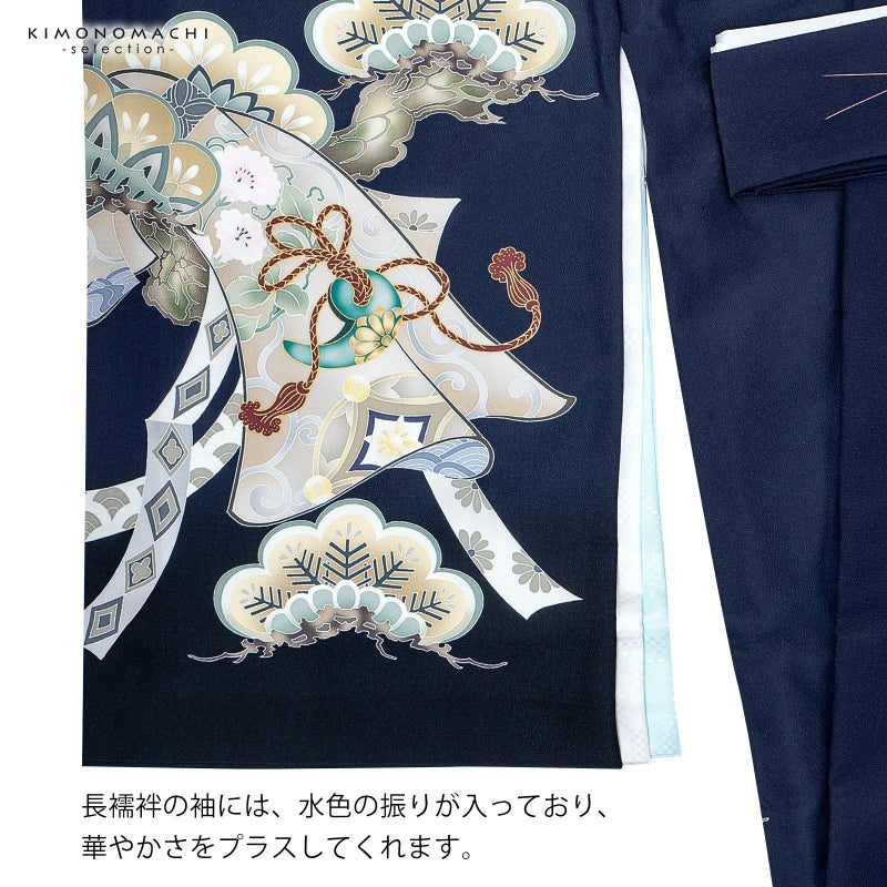 男の子らしく勇ましい、カッコイイ雰囲気。美しい発色の生地に美しい模様。長襦袢の中に水色の振りが入っており、お洒落な雰囲気をプラスしてくれます。