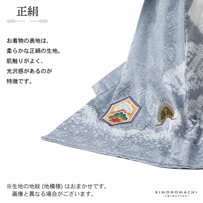 【色柄】地模様のある明るい青みの灰色の地。疋田で表現された波に雲、松。その上に薄茶に灰青、深緑、橙色、藤色、紺、浅い黄色など多彩な刺繍で表現された鷹。青緑や浅い緑の松に赤茶、香色、橙色、紺の宝尽くしや亀甲紋。多色使いの重厚な刺繍が他にはない高級感を演出します。