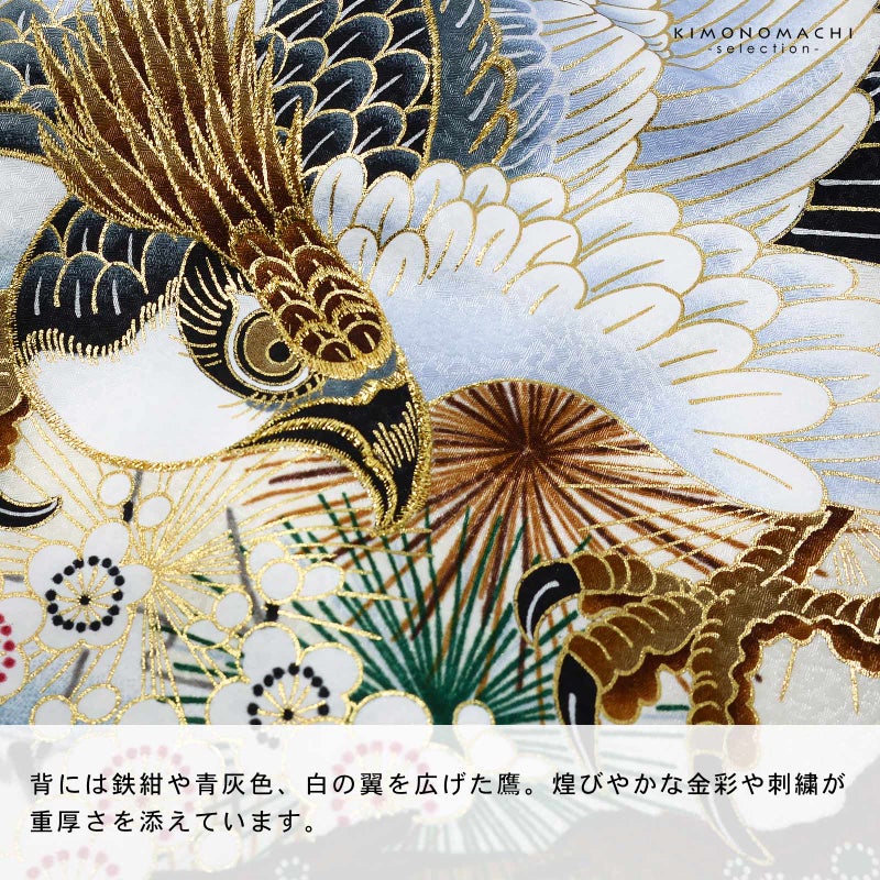 【色柄】着物は細かな地紋のある灰みの水色地にやわらかいアイボリーの腰替わり。背には鉄紺や青灰色、白の翼を広げた鷹。煌びやかな金彩や刺繍。茶色に緑の松葉、白梅などに、水色や青碧色、茶色の荒磯に虎。豪華で勇壮な雰囲気です。襦袢は白色の地紋。袖の振りは淡い水色。