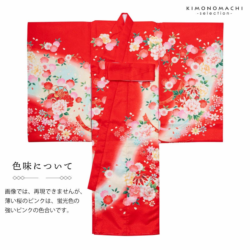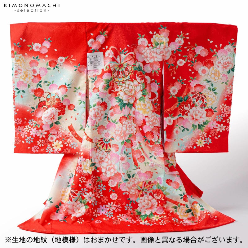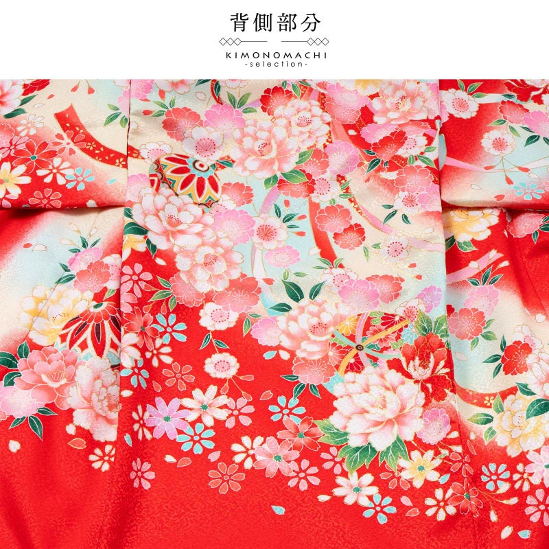 やや柔らかい赤地に淡い黄色、水色のぼかし。背には赤に黄色や水色、薄紫などの配色の鞠に組紐。赤や薄ピンクの牡丹。黄色や赤、ピンクなどの鞠に牡丹や八重桜などの花々が全体に表現されています。ポイントの刺繍や金彩が豪華さと煌びやかさを添えます。襦袢は薄ピンク。袖の振りは赤。