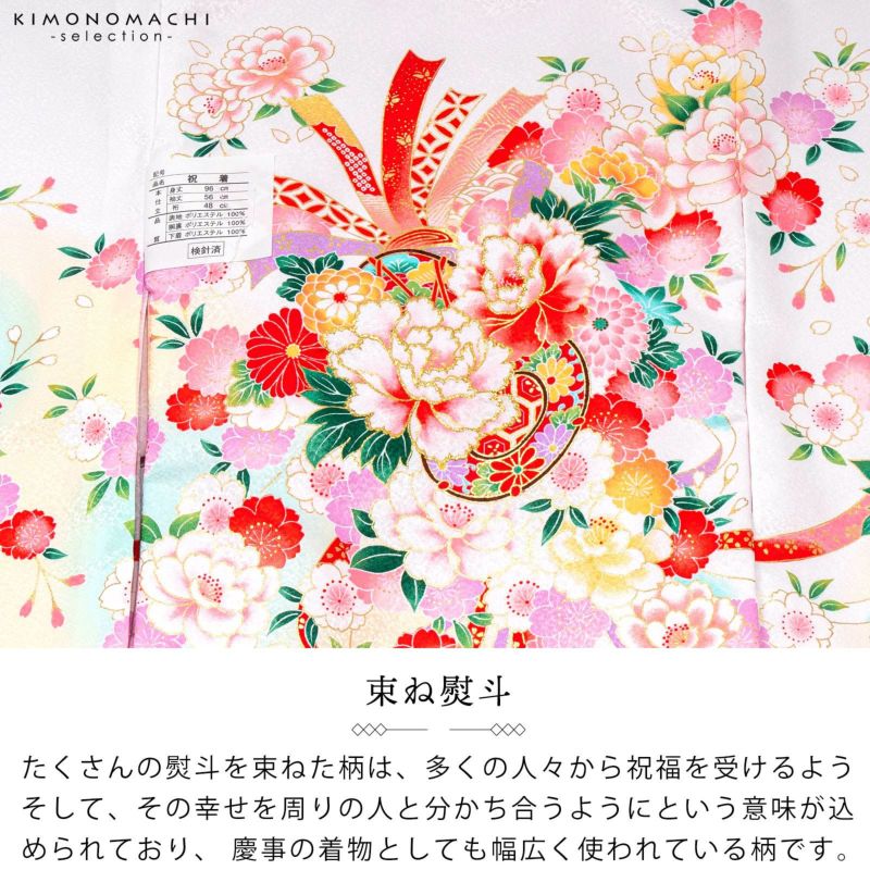白地に淡い黄色、水色、赤のぼかし。背には赤に黄色や水色、薄紫などの配色の鼓に、赤や薄ピンクの牡丹。吉祥紋の入った束ね熨斗。淡いピンクや薄紫の桜や菊の花々が全体に表現されています。ポイントの刺繍や金彩が華やかさと煌びやかさを添えます。襦袢は薄ピンク。袖の振りは赤。