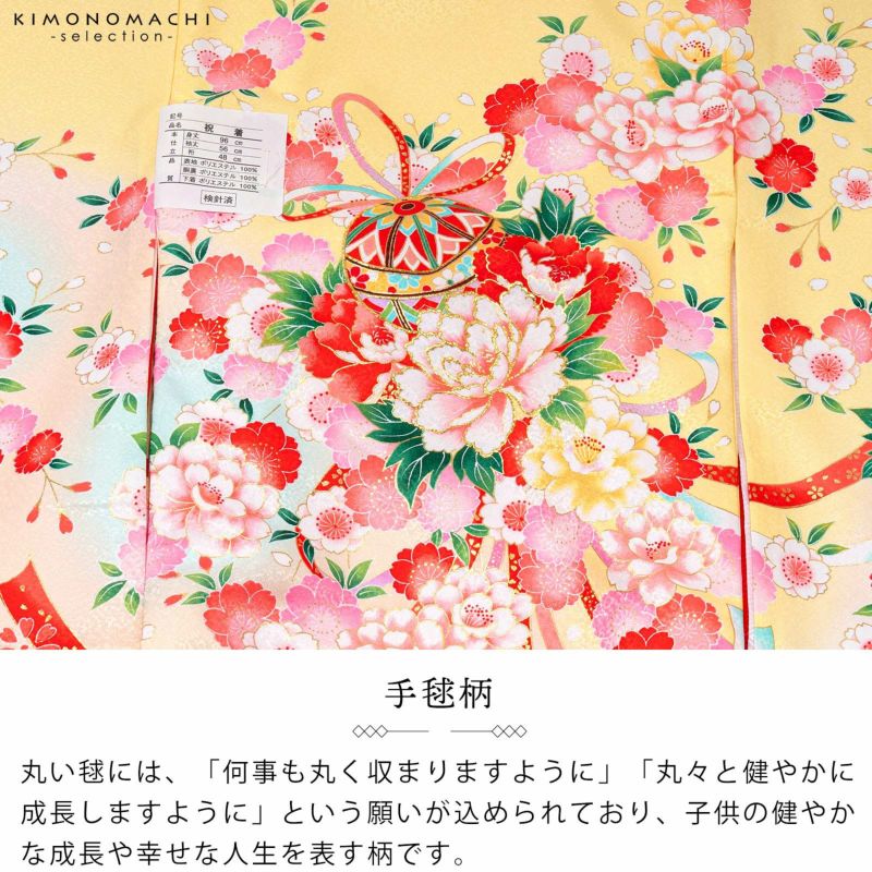 明るいクリームイエロー地に淡い黄色、水色、赤のぼかし。背には赤に黄色や水色、薄紫などの配色の鞠に組紐。赤や薄ピンクの牡丹。黄色や赤、ピンクなどの鞠に牡丹や八重桜などの花々が全体に表現されています。ポイントの刺繍や金彩が晴れやかさと煌びやかさを添えます。襦袢は薄ピンク。袖の振りは赤。