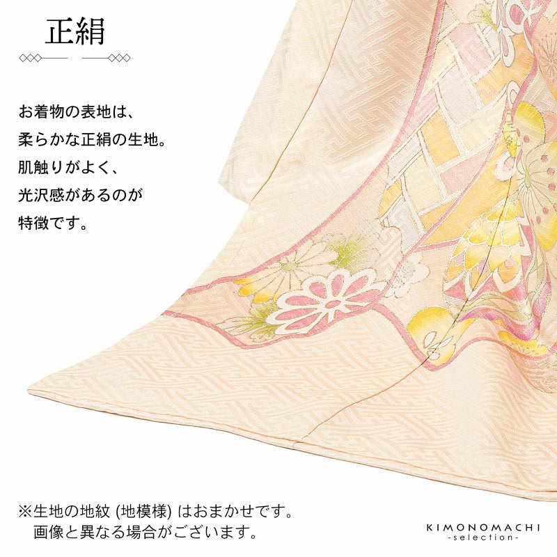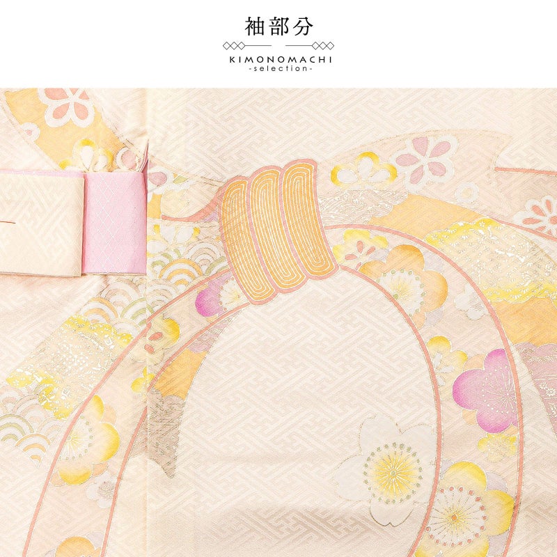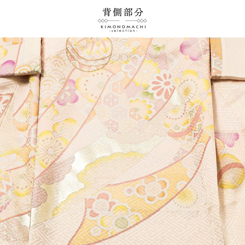 【色柄】表地は地模様のある淡く明るいベージュ。背から袖、裾にかけて、菊や梅、青海波や亀甲など小紋を詰めた大きな束ね熨斗が広がり、手毬や花が添えられたデザイン。明るいピンクや淡い橙色、藤色、淡い黄色、薄緑色など優しく上品な配色。熨斗の結び目のピンクがアクセント。ポイントの金駒刺繍や、金銀の刺繍が煌びやかさを添えます。襦袢は薄ピンク。袖の振りは赤。