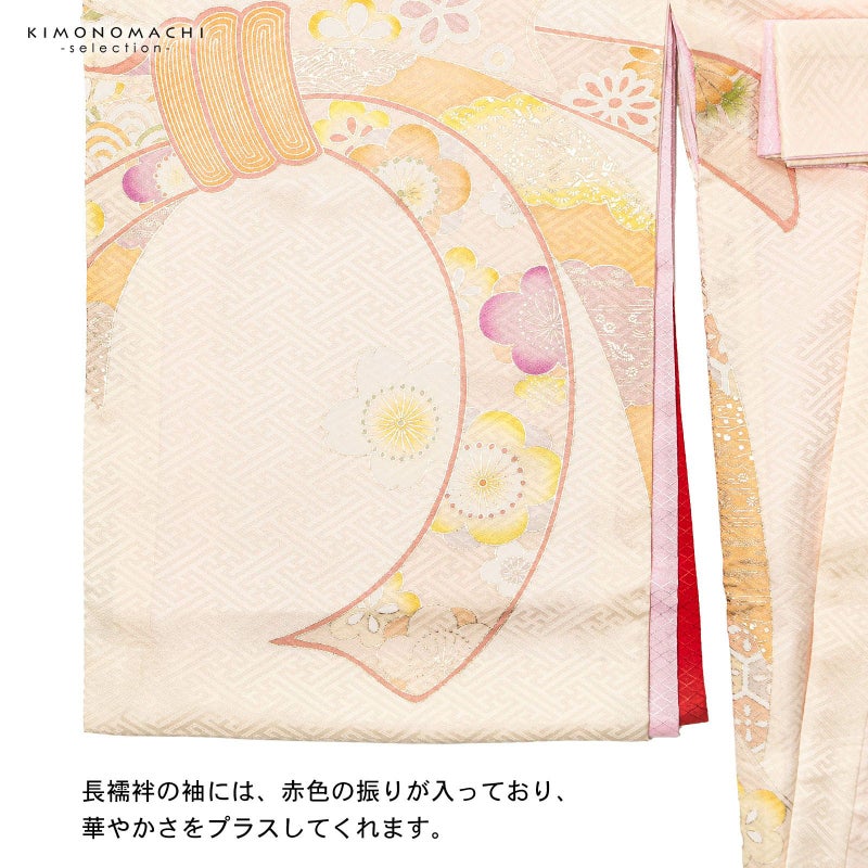 高級感がありつつも、女の子らしく可愛らしい雰囲気。美しい発色の生地に美しい模様。長襦袢の中に赤色の振りが入っており、華やかさをプラスしてくれます。細部に至るまで、こだわったお品です。