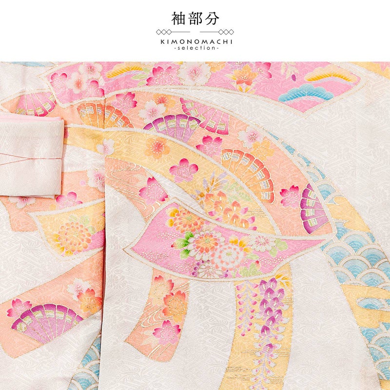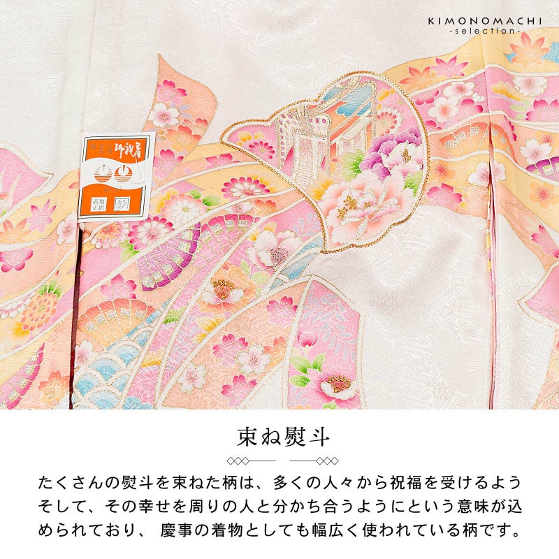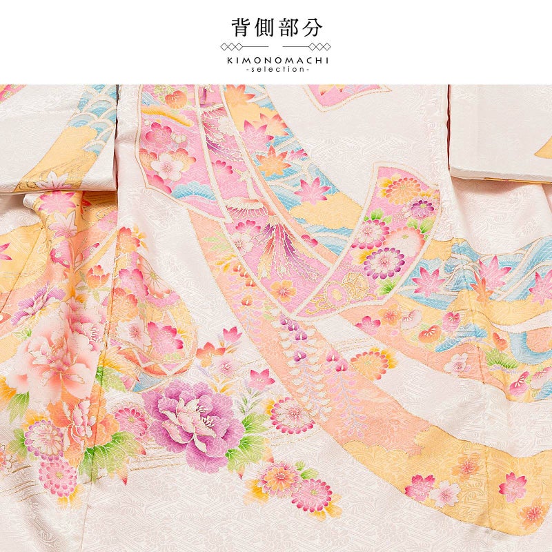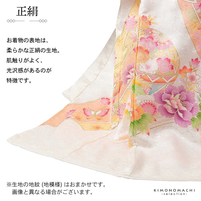 【色柄】表地は地模様のあるやわらかい白、襦袢の薄いピンクが映ってほんのり桜色に見えます。背から袖、裾にかけて、菊や桜、橘、楓、松に檜扇などの小紋を詰めた大きな束ね熨斗が広がるデザイン。明るいピンクや珊瑚色、淡い黄色、水色など優しい配色が優雅で上品な印象です。ポイントの金駒刺繍や、金銀ラメ糸の刺繍が煌びやかさを添えます。襦袢は薄ピンク。袖の振りは赤。